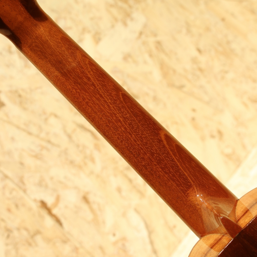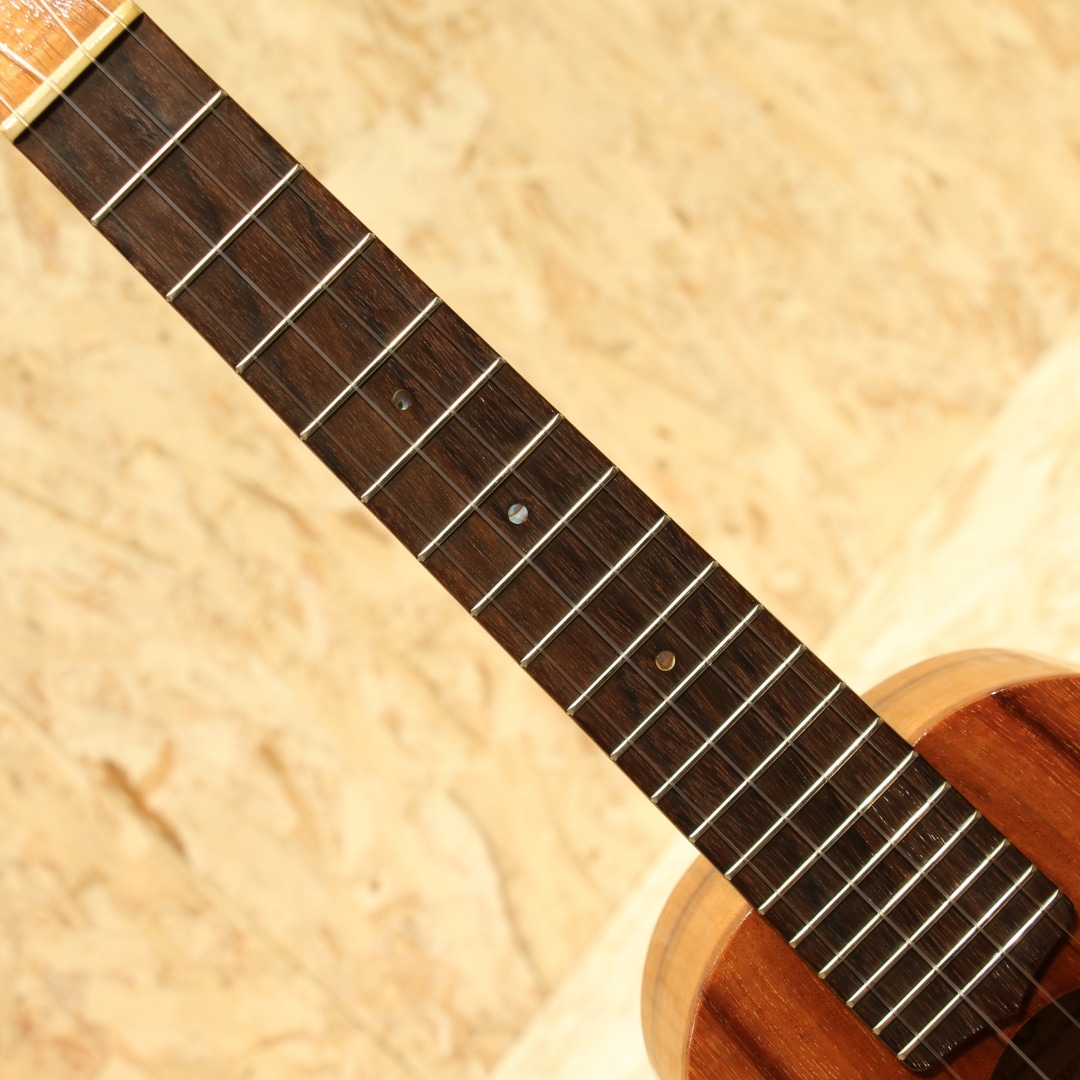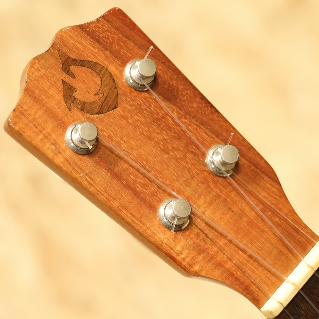 1993年に設立されたメイド・イン・ハワイブランド"G-string"。設立から2000年後期頃までは複数の職人によって手掛けられており、現在はアメリカ本土に工房を移しデレク・シミズ氏により製作されています。本器はハラワバレー時代の1本、ハワイアンコアをボディに使用したコンサートモデル。2000年代製のUSED品です。ハワイアンコアボディ、マホガニーネック、ローズウッド指板&ブリッジ、アバロン指板ドットインレイ、フリクションペグ。現在は手工製作となり価格も高騰していますが、当時は手の届きやすい価格帯にて幅広く展開。たちまち人気を集め、ハワイアン3大ブランドの一つとまで称されていました。本器はハワイブランドらしく実用性の高いスペックを持った個体です。装飾を省きシンプルなルックス、ヘッドには薄っすらと揺らぐ杢目のハワイアンコアを使用しており、自然の生み出す美しさを存分に感じさせられます。塗装においても必要最低限、他ブランドと比べても薄めとなっておりその分ふくよかでボリューム感のある音色を生み出してくれます。甘いトーンを持ちながら少し乾いたスッキリとした音色が心地よく、サクサクとストラミングしたくなる1本です。歌モノと一緒に、たまにはソロを弾いても良いでしょう。14フレットジョイントでハイポジションへのアクセスも難なく対応できます。良く弾き込まれてきたのか指板ローフレットあたりに若干のへこみ、その他ボディに小さなへこみ傷や薄い擦れキズが若干見られますが、全体を通しての使用感は薄くキレイな状態をキープされています。ネックの状態や演奏性も良し、これからも使っていける1本です。ハワイ製のしっかり使えるウクレレをお探しの方には是非おススメしたい1本です。セミハードケースが付属します。