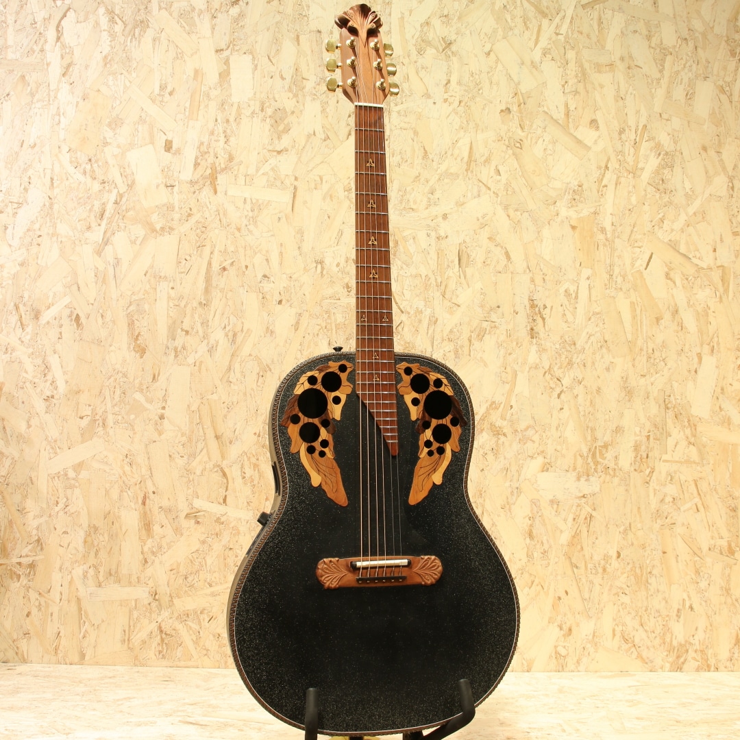 オべーション創始者チャーリー・カマンの生音へのさらなる探究心から1976年に誕生したアダマス。1976-77年にプロトタイプを多く生産し、1978年頃から今も残るスタイルのモデルを製造してきました。本器はノンカッタウェイ、ブラックカラーの"1687-5"、1993年製USED品。ウッドトップの約3分の1の薄さでも十分な強度を得られるアダマス独自のカーボングラファイトトップ、リラコード樹脂ディープボウル、ウォルナットネック、ウォルナット指板&ブリッジ、オリジナルシャーラーペグ、オリジナルウッド指板インレイ、オリジナルファンブレイシング、ダブルエポレットサウンドホール。93年後期から94年にかけてバッテリーボックスがボディ内部から外部アクセスに変更、本器は変更後のスライド式外部アクセスタイプ、バッテリー交換もしやすく嬉しい仕様です。搭載プリアンプは不動の人気を誇る"OP24"。3バンドEQ、1ボリュームノブを備えたシンプルな操作性、本器特有の太めのラインサウンドはバンド編成でも十分な存在感を放ち、弾き語り等でも安定感のあるバッキングサウンドを生み出します。アダマスでしか得られない深みのある独特な響きとタイトな立ち上がりのレスポンス。エッジの効いた鋭いトーンとコンプがかった響きは唯一無二な音色として多くのプレイヤーから愛されています。指で弾く際には太さのある甘いトーンで響くなど多彩なジャンルで扱えるキャラクターも愛される理由の1つです。この年代に見られるボディのラメもトップ、バック面ともに細かくしっかりと残っており、その他使用感も見られない大変綺麗なコンディションが保たれています。ネックコンディションも良好で、現在シムがセットされた状態ですがアダマスらしいとても弾きやすいセッティングです。フレット残りも充分でこれからもガンガンご使用いただけます。世代を超えて根強い人気のアダマス、他では体感できないであろう個性が光る機種です。唯一無二と評されるサウンド、是非お手元でご体感ください。オリジナルハードケースが付属します。