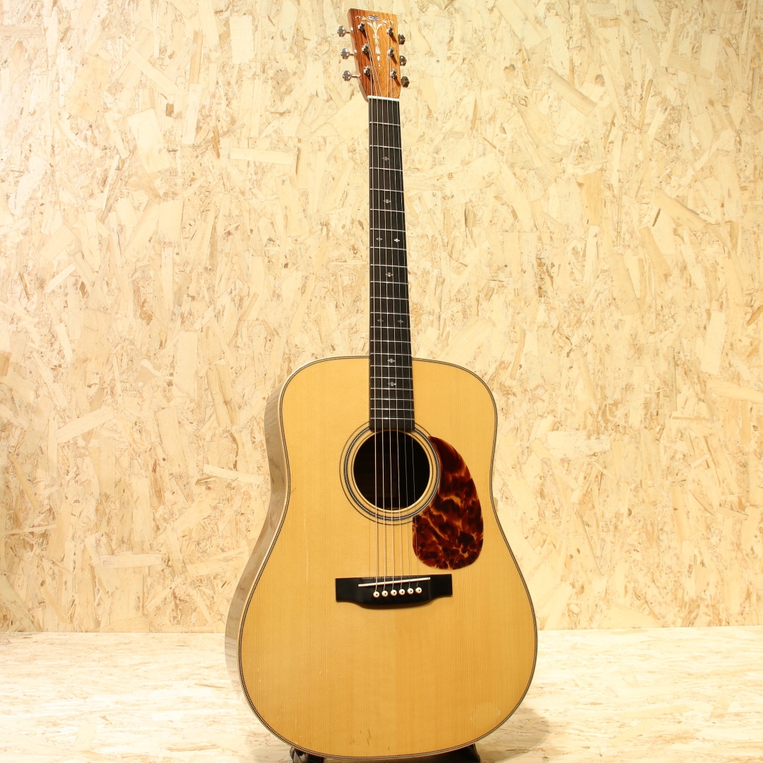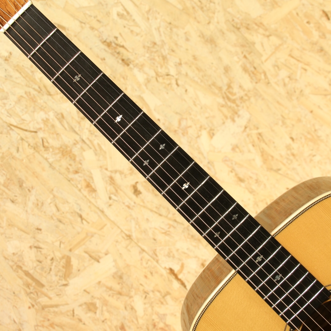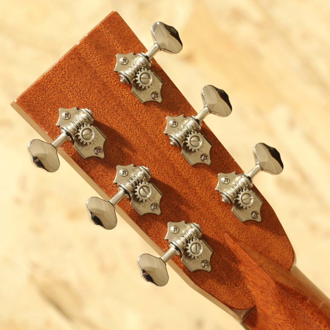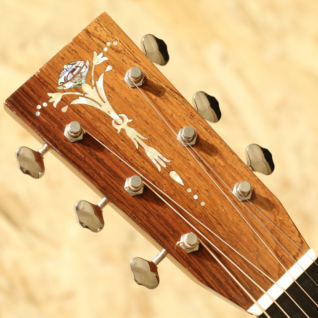 1962年より福岡久留米にてギター製造を行う老舗純国産ギターブランド、アストリアスギター。少数精鋭の職人が半手工形態で手掛けるギターの完成度の高さは国内外問わず定評があります。本器は限定10本のみで製作された"D.CUSTOM ENG"、2023年製USED品。イングルマンプルーストップ、インディアンローズウッドサイド&バック、マホガニーネック、エボニー指板&ブリッジ、ゴトーオープンバッククロームペグ、ハカランダ天神板、トーティスピックガード、ヘリンボーントリム&ロゼッタ、メイプルバインディング、ジグザクバックストリップ、ノンスキャロップドXブレイシング。同社ラインナップのD.プリウォーを単板仕様へ、細かな装飾を変えたモデルD.Custom。エボニー指板&ブリッジであったり、ロゼッタがヘリンボーンになっている点、ヘッドの突板にハカランダが使用されている点などが挙げられます。またトップ面のみラッカー仕上げにしており、トップ面がより柔軟に振動することを可能にした仕様です。ピックガードにはアメリカの製作家グレーベンが開発に関わったトーティスが使用されており、べっ甲に近しい風合いを持っています。各ディティールも古いスタイルを踏襲し、独自の解釈を加えて設計や製作がされています。本器はそこからトップ材をイングルマンスプルースにカスタムされた1本。柔らかく比較的軽い材であるイングルマン。軽いタッチでも反応しやすく空気感を含んだトーン、やや膨らむような低音感や繊細で上品なサウンドを生み出す材です。ブレイシングはノンスキャロップ仕様の為、暴れることのない制御されたクリアなサウンド。輪郭のクッキリとしたサウンド、音の立ち上がりも早く強いタッチでも澄んだ音色を響かせるポテンシャルを持っています。サイドバックのインディアンローズは定番の材ですが、やはり定番を押さえた楽器には馴染み深いものを感じられます。重さのあるロー感や煌びやかで上品なサウンドを生み出す材。これらの特徴からスタイルを問わないオールマイティさを誇り、繊細なフィンガースタイルからアグレッシブなストロークまで対応できる1本です。しっかりと使われてきたのか、ボディトップやサイド、ネック裏等に塗装面の打痕や擦れ傷が見られます。割れ修正は無く、ネックコンディションも良好。ネックヒールストラップピンも増設、実践向きに手入れのされた本器。当時限定10本生産のみ、お買い逃がしされた方もいらっしゃるのではないでしょうか。使用感はあるものの演奏性の整えられた1本。是非おためしください。