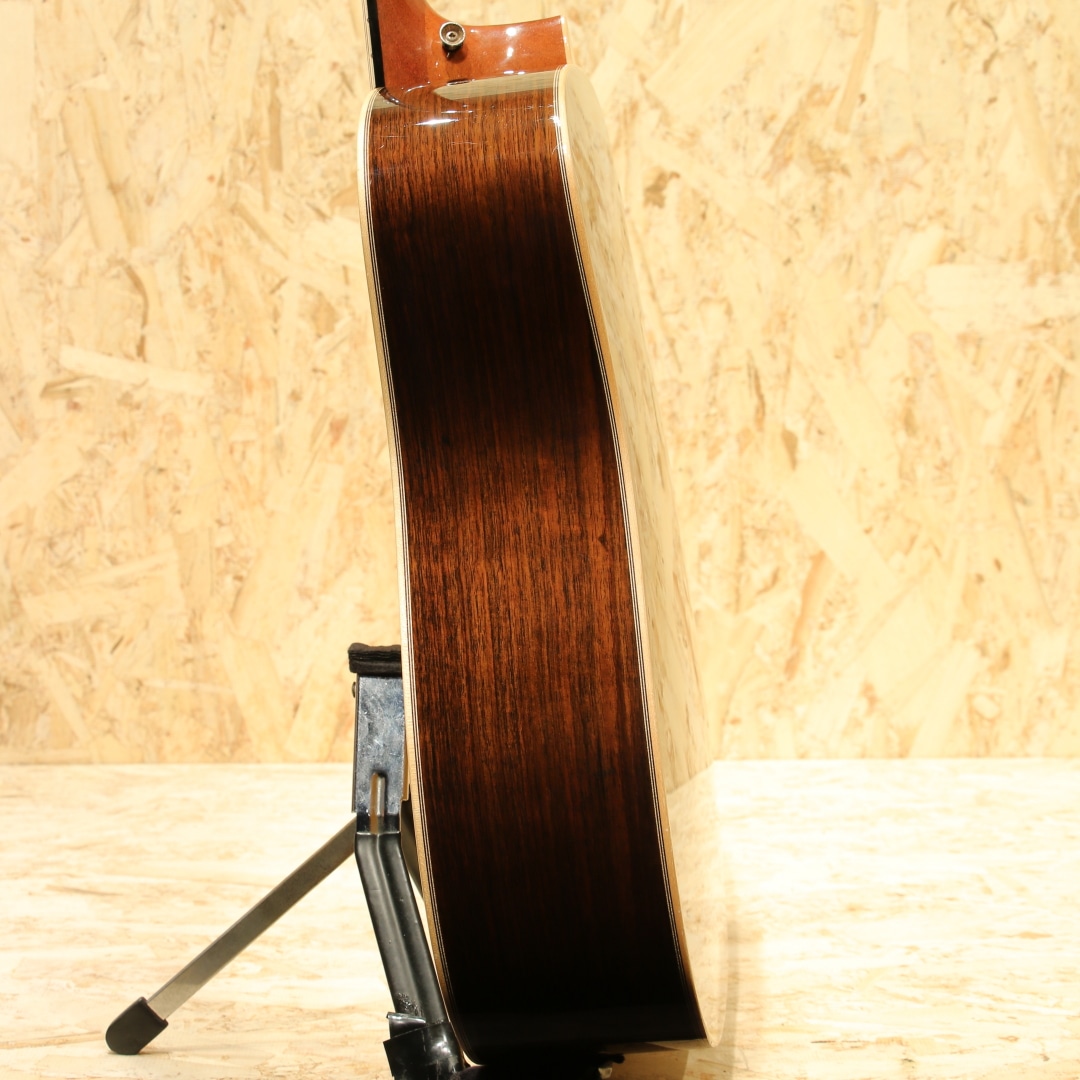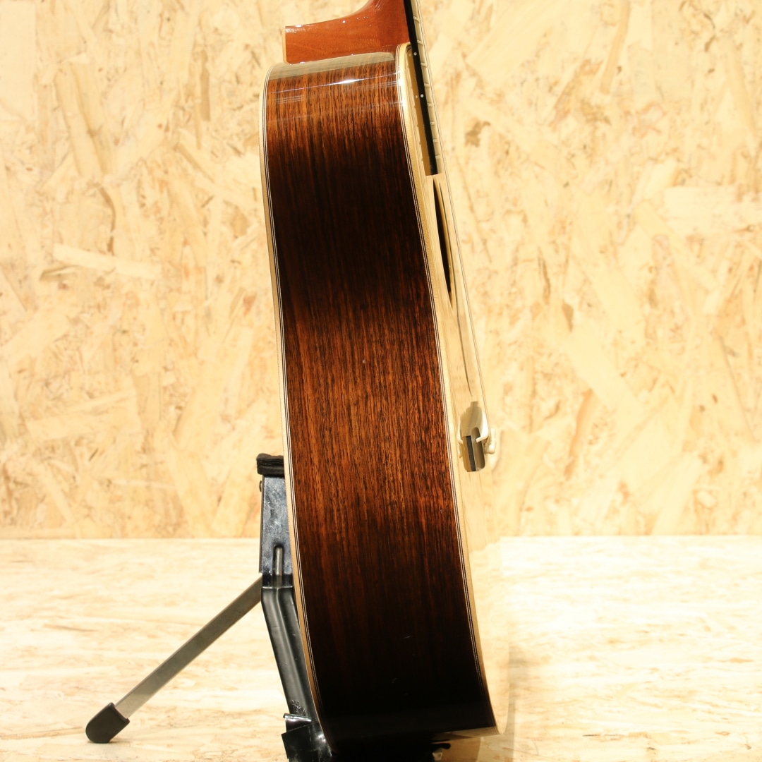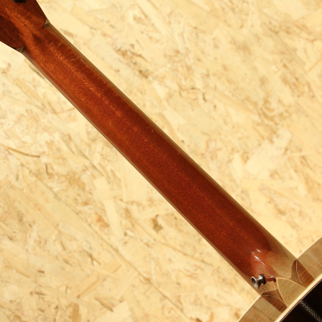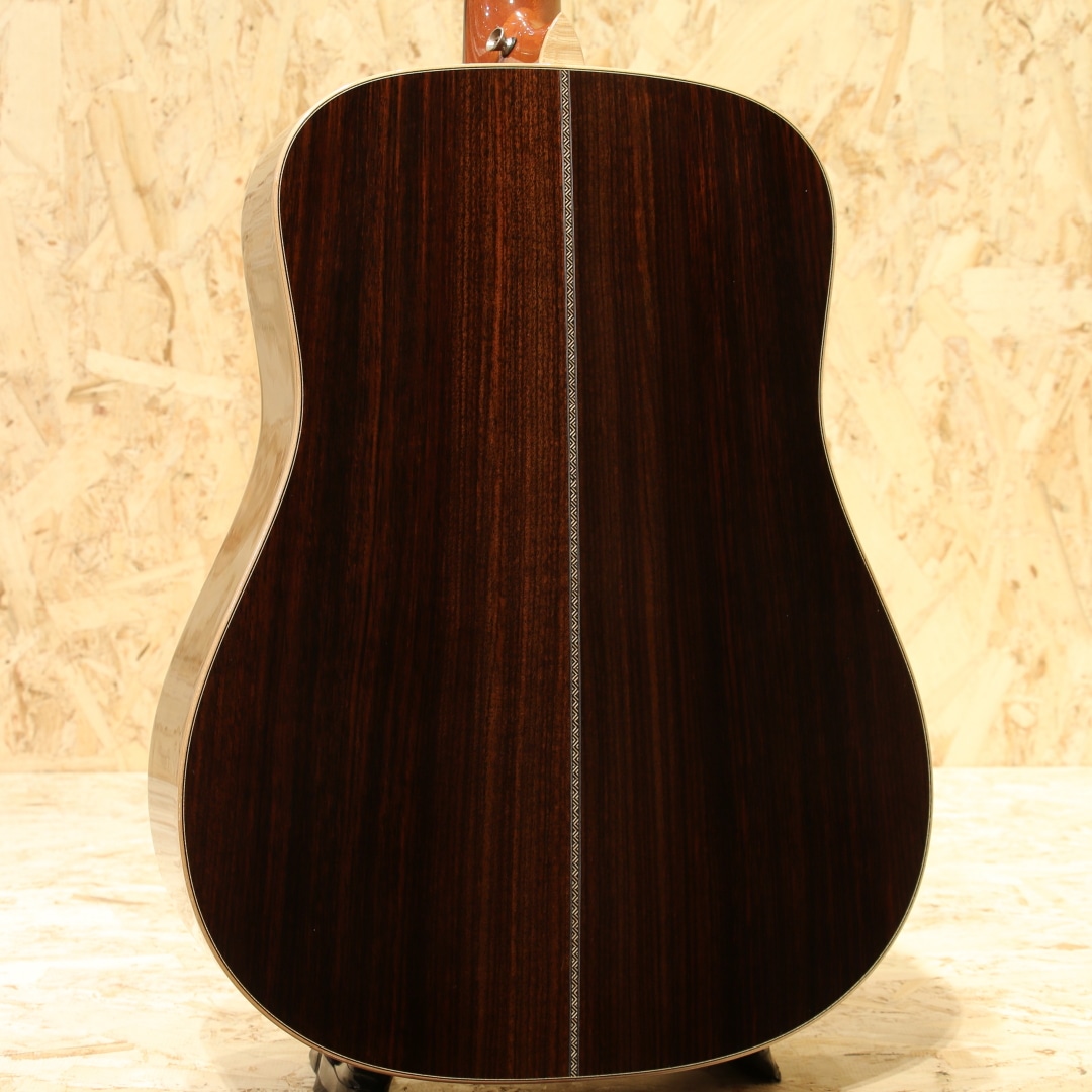 1962年より福岡久留米にてギター製造を行う老舗純国産ギターブランド、アストリアスギター。少数精鋭の職人が半手工形態で手掛けるギターの完成度の高さは国内外問わず定評があります。本器は限定10本のみで製作された"D.CUSTOM ENG"、2023年製USED品。イングルマンプルーストップ、インディアンローズウッドサイド&バック、マホガニーネック、エボニー指板&ブリッジ、ゴトーオープンバッククロームペグ、ハカランダ天神板、トーティスピックガード、ヘリンボーントリム&ロゼッタ、メイプルバインディング、ジグザクバックストリップ、ノンスキャロップドXブレイシング。同社ラインナップのD.プリウォーを単板仕様へ、細かな装飾を変えたモデルD.Custom。エボニー指板&ブリッジであったり、ロゼッタがヘリンボーンになっている点、ヘッドの突板にハカランダが使用されている点などが挙げられます。またトップ面のみラッカー仕上げにしており、トップ面がより柔軟に振動することを可能にした仕様です。ピックガードにはアメリカの製作家グレーベンが開発に関わったトーティスが使用されており、べっ甲に近しい風合いを持っています。各ディティールも古いスタイルを踏襲し、独自の解釈を加えて設計や製作がされています。本器はそこからトップ材をイングルマンスプルースにカスタムされた1本。柔らかく比較的軽い材であるイングルマン。軽いタッチでも反応しやすく空気感を含んだトーン、やや膨らむような低音感や繊細で上品なサウンドを生み出す材です。ブレイシングはノンスキャロップ仕様の為、暴れることのない制御されたクリアなサウンド。輪郭のクッキリとしたサウンド、音の立ち上がりも早く強いタッチでも澄んだ音色を響かせるポテンシャルを持っています。サイドバックのインディアンローズは定番の材ですが、やはり定番を押さえた楽器には馴染み深いものを感じられます。重さのあるロー感や煌びやかで上品なサウンドを生み出す材。これらの特徴からスタイルを問わないオールマイティさを誇り、繊細なフィンガースタイルからアグレッシブなストロークまで対応できる1本です。しっかりと使われてきたのか、ボディトップやサイド、ネック裏等に塗装面の打痕や擦れ傷が見られます。割れ修正は無く、ネックコンディションも良好。ネックヒールストラップピンも増設、実践向きに手入れのされた本器。当時限定10本生産のみ、お買い逃がしされた方もいらっしゃるのではないでしょうか。使用感はあるものの演奏性の整えられた1本。是非おためしください。