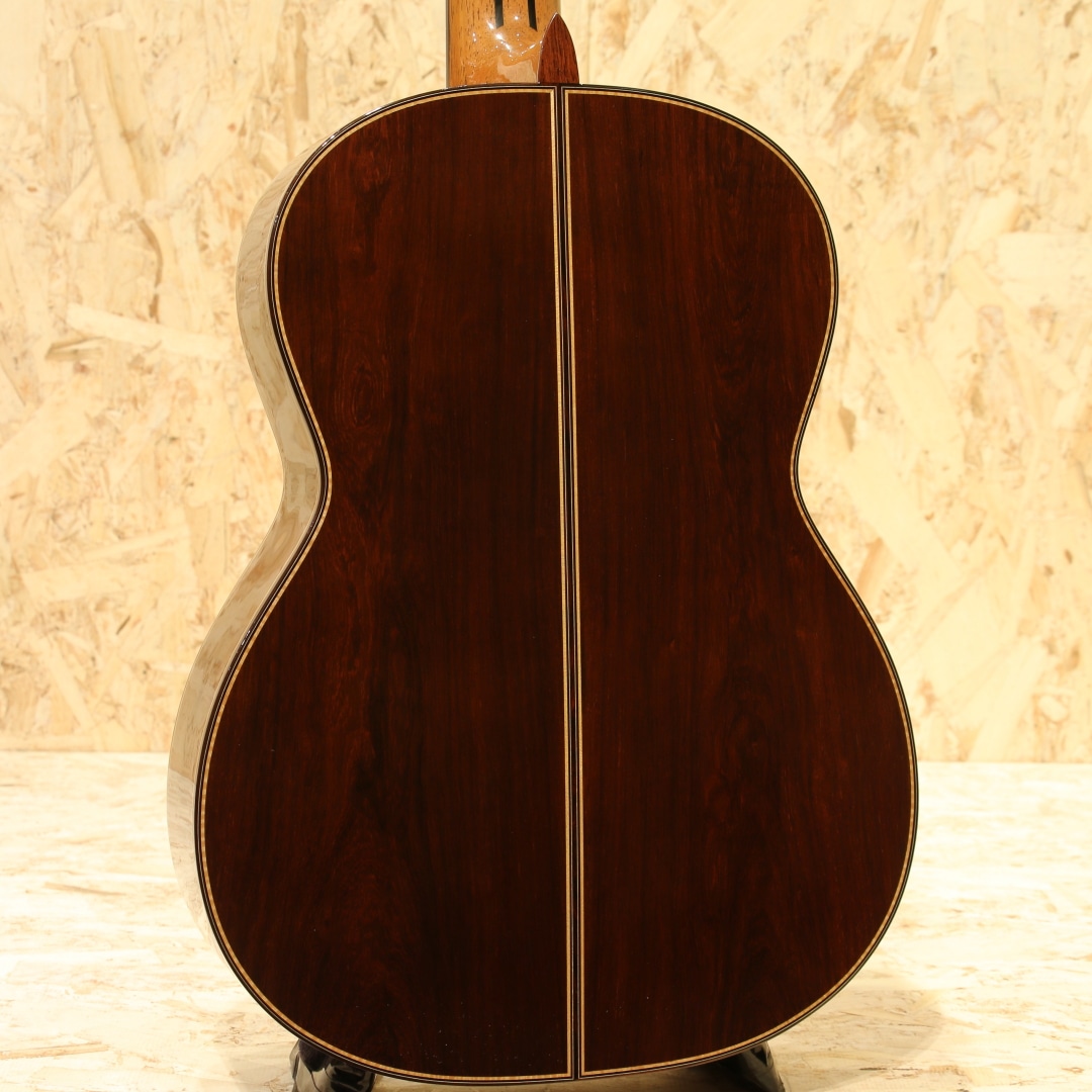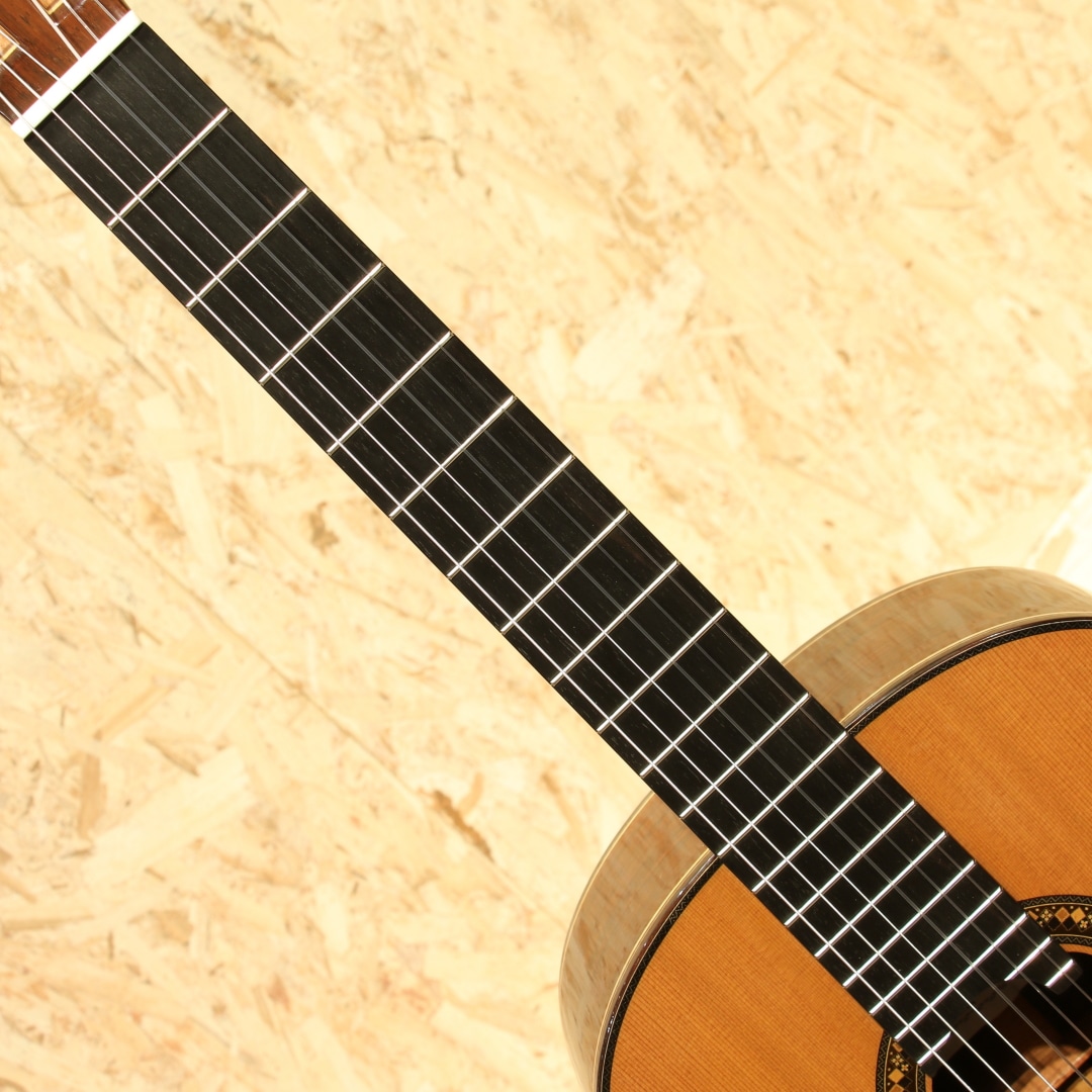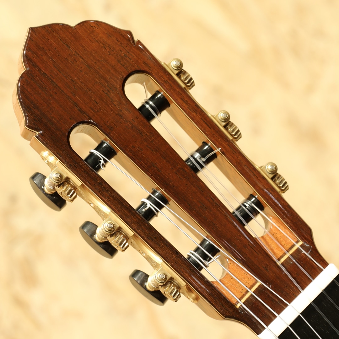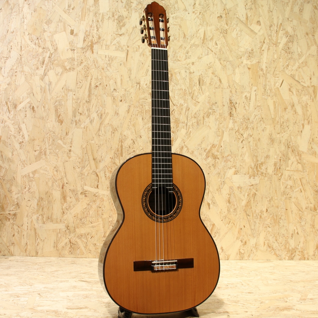祖父である日本が誇る名工"河野賢"に憧れ、河野ギター製作所に入社。叔父である"桜井正毅"の下で10数年ギター製作に励み、2021年に製作家としてスタートを切りました。河野賢と桜井正毅の研究と経験を受け継ぎ、ギターの品質を永続させるだけでなく新しい技術への挑戦、モデルの開発にも取り組んでいます。フラッグシップモデルである手工モデルの"ソル"、同じく手工モデルの"ルナ"、コストを抑えながら氏が求めるサウンドを追求した工房で製作されている"ステラ"の3機種が展開。本器は"ルナ"のシダートップモデルの使用感極薄2025年製USED品。シダートップ、マダガスカルローズウッドサイド&バック、マホガニー(もしくはセドロ)ネック、エボニー指板、マダガスカルローズウッドブリッジ。塗装には伝統的なカシュ―塗装を採用、力木には材の経年変化を考慮した独自の設計が採用されています。華美過ぎない倍音を含みながらクリアな高音域、力強さもありながら暴れすぎず存在感のある中低音域。タッチレスポンスが早くボリュームも充分、サウンドレンジも広く、素晴らしいバランスです。シダー材の豊潤で甘く深い音色ですが、明瞭でハツラツとしたトーンを併せ持つサウンド。河野賢、桜井正毅のクオリティを受け継ぎながら君島聡が生み出すサウンドは、クラシックギター界を大きく牽引していくことでしょう。大きな使用感はなく美しい状態が保たれています。ネックコンディションも良好、馴染みの良いネックシェイプで演奏性も抜群です。数年前に君島ブランドが販売開始されてから常に新規オーダーは数年待ちの状態。新品と見紛うような貴重なUSED品、是非この機会をお見逃しなく。汎用セミハードケースが付属します。