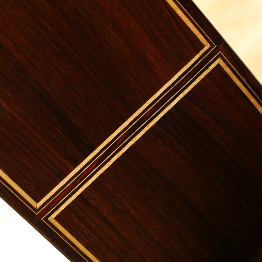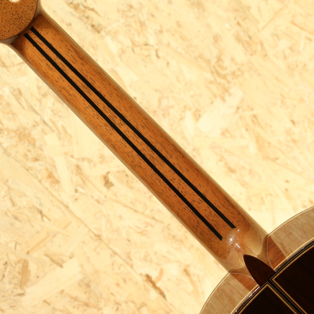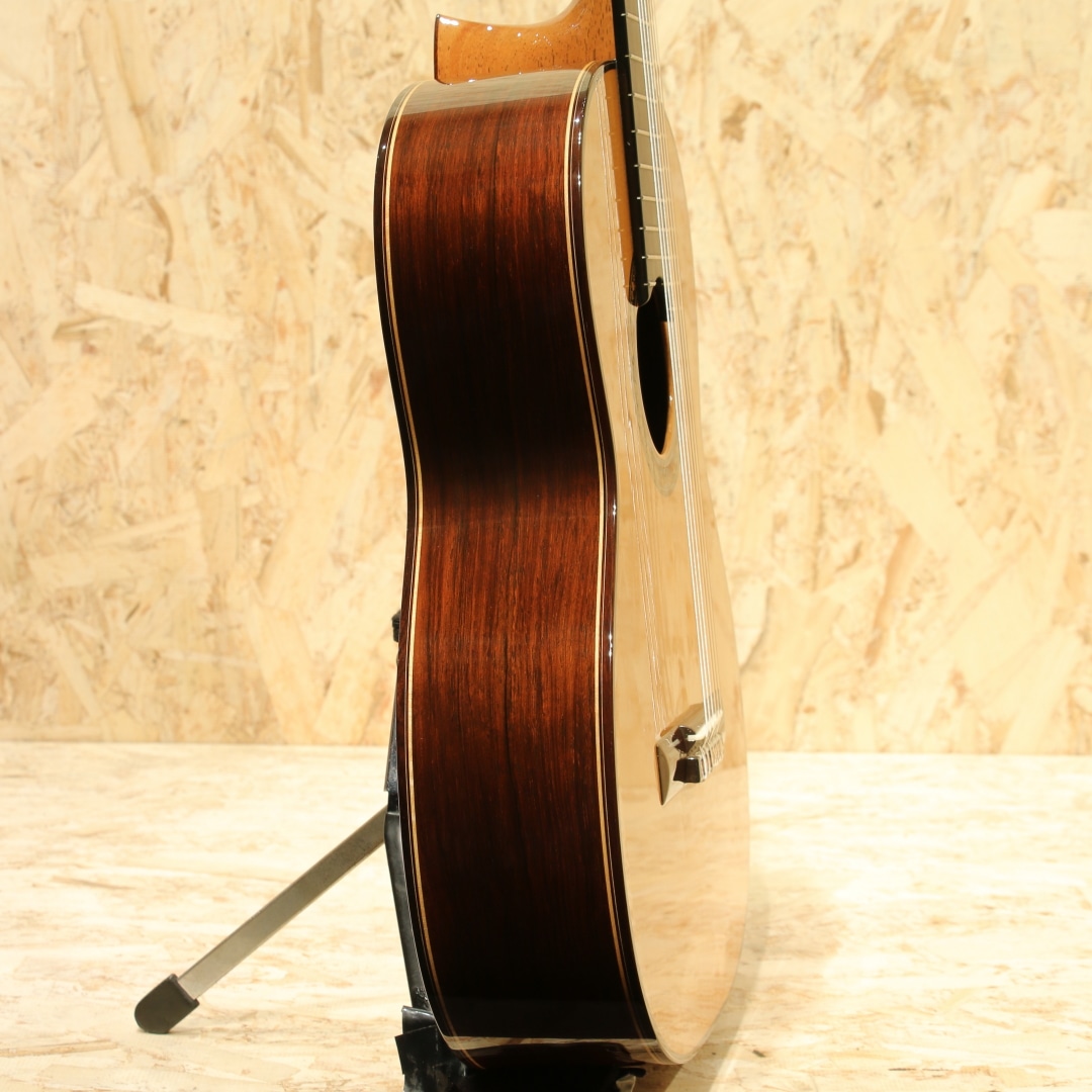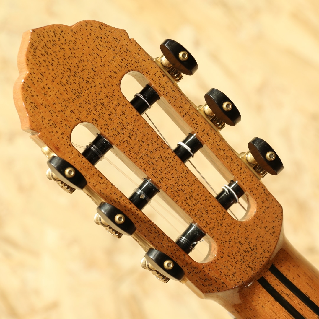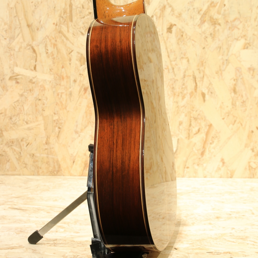 祖父である日本が誇る名工"河野賢"に憧れ、河野ギター製作所に入社。叔父である"桜井正毅"の下で10数年ギター製作に励み、2021年に製作家としてスタートを切りました。河野賢と桜井正毅の研究と経験を受け継ぎ、ギターの品質を永続させるだけでなく新しい技術への挑戦、モデルの開発にも取り組んでいます。フラッグシップモデルである手工モデルの"ソル"、同じく手工モデルの"ルナ"、コストを抑えながら氏が求めるサウンドを追求した工房で製作されている"ステラ"の3機種が展開。本器は"ルナ"のシダートップモデルの使用感極薄2025年製USED品。シダートップ、マダガスカルローズウッドサイド&バック、マホガニー(もしくはセドロ)ネック、エボニー指板、マダガスカルローズウッドブリッジ。塗装には伝統的なカシュ―塗装を採用、力木には材の経年変化を考慮した独自の設計が採用されています。華美過ぎない倍音を含みながらクリアな高音域、力強さもありながら暴れすぎず存在感のある中低音域。タッチレスポンスが早くボリュームも充分、サウンドレンジも広く、素晴らしいバランスです。シダー材の豊潤で甘く深い音色ですが、明瞭でハツラツとしたトーンを併せ持つサウンド。河野賢、桜井正毅のクオリティを受け継ぎながら君島聡が生み出すサウンドは、クラシックギター界を大きく牽引していくことでしょう。大きな使用感はなく美しい状態が保たれています。ネックコンディションも良好、馴染みの良いネックシェイプで演奏性も抜群です。数年前に君島ブランドが販売開始されてから常に新規オーダーは数年待ちの状態。新品と見紛うような貴重なUSED品、是非この機会をお見逃しなく。汎用セミハードケースが付属します。