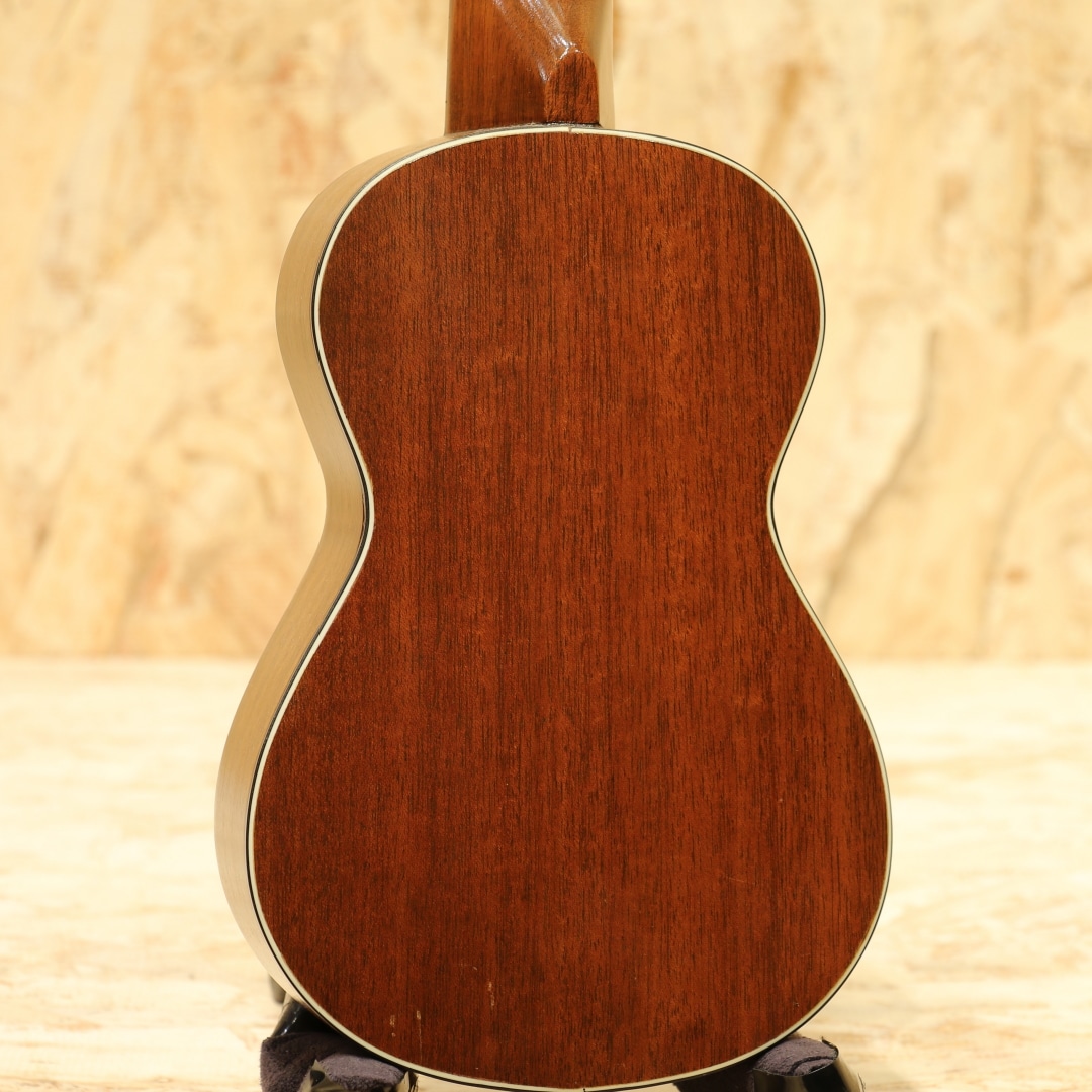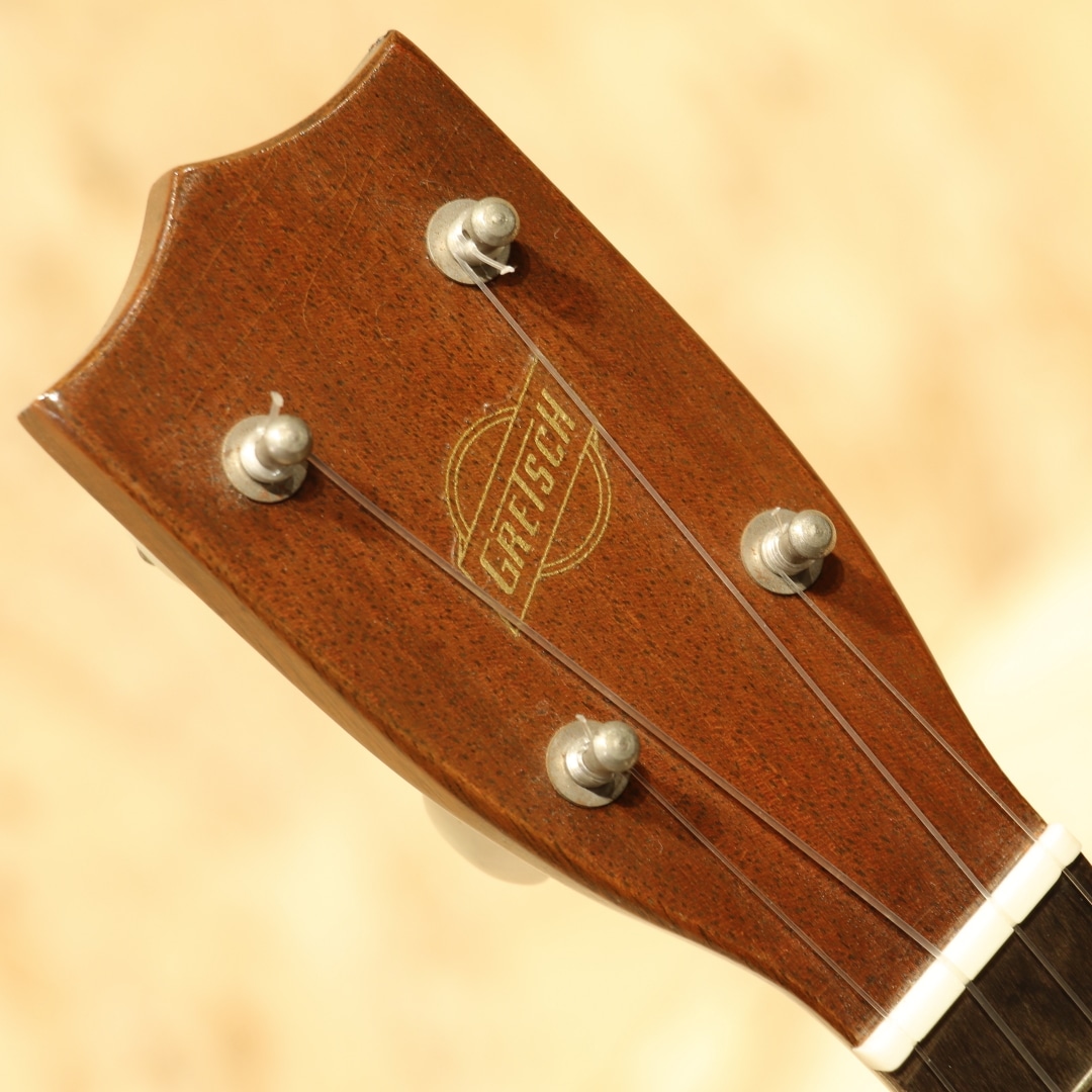 ギターを始めドラムやベース等多岐に渡り楽器を製造している老舗ブランド”Gretsch”。独自のアイデンティティを持ち根強いファンの多いブランドです。かつてはMARTINやGIBSONのようにウクレレも製作していました。本器は1950年代頃の製造と思われるソプラノウクレレ。マホガニーボディ、マホガニーネック、ローズウッド指板&ブリッジ、ワンリングロゼッタ、ブラックバインディング、デカールロゴ、幅広ヘッドシェイプ。モデルとしてはStyle-2ですが、MARTINのStyle-1を彷彿とさせるようなデザインです。サウンドはヴィンテージウクレレ特有の経年でしか味わうことのできない大音量で軽快な鳴り。マホガニーのカラッとしたクリスピーさも相まって心地よくもジャカジャカかき鳴らしたくなるサウンドです。以前に全体的に塗装の上吹きをされた形跡が見られますが、いなたさは無く丁寧に作業されたことがうかがえます。4弦側のトップ面の膨らみ付近に杢目に沿った塗装引きがありますが、木部までは貫通しておらず表面上のものです。2弦ブリッジ溝に木部がチップした跡が見られますが現在は問題なく弦が止まっている為、ご使用に影響はありません。その他、バック面の塗装に焼け跡のようなもの、1フレットネック裏にペンでつけられたような点印など細かな使用感はありますが、木部割れ等はございません。市場でもほとんど見かけないグレッチウクレレ、しっかりと手入れのされた1本です。こちらの商品にケースは付属いたしません。