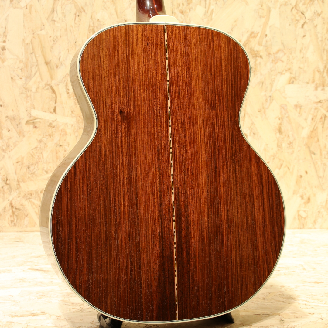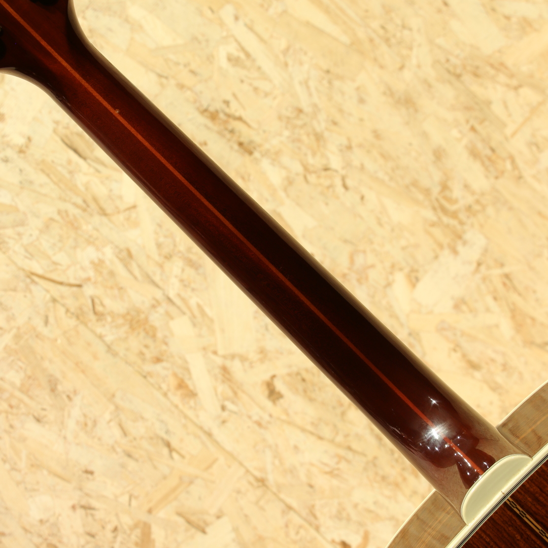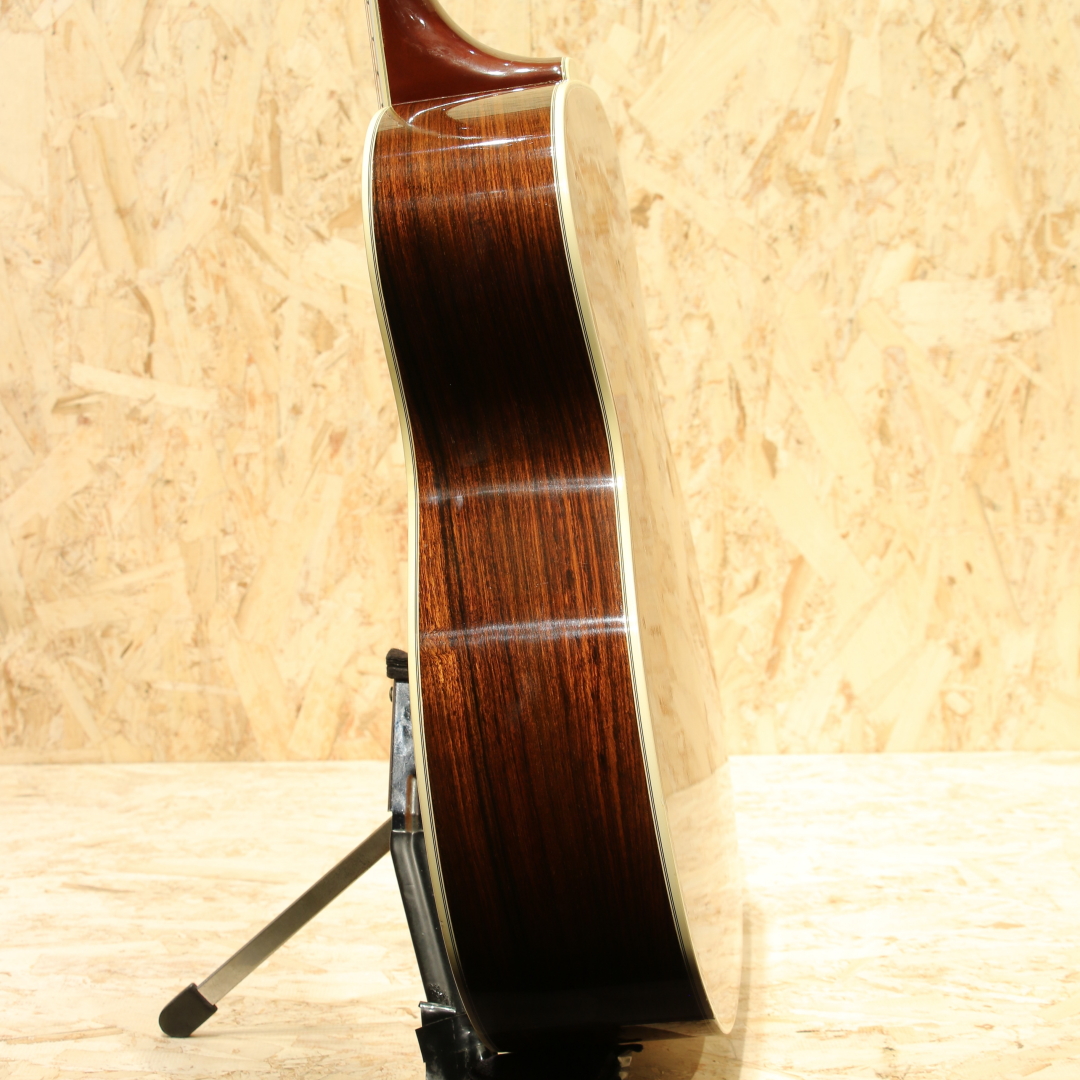 Paul SimonやJohn Denver、国内では井上陽水氏、南こうせつ氏、松山千春氏など数多のフォークシンガー達が愛した"Guild (ギルド)"。古くは"Martin"、"Gibson"と並び御三家ブランドとして名を馳せていたアメリカを象徴するブランドのひとつ。現在もコアなファンからの支持が厚く、ギター愛好家の間でも人気のある玄人好みなブランドです。本器はサイド&バックにローズウッド材を使用したモデル”F-50R”。1975年製のUSED品です。スプルーストップ、ローズウッドサイド&バック、マホガニーネック、エボニー指板、ローズウッドブリッジ、オリジナルゴールドペグ。シンプルな装飾、質実剛健なスタイルは媚びることのないギルドの職人気質を感じさせます。その気質はサウンドにも表れており、無骨で重量感のある音色は健在。ギルド特有のパワフルでガリっとしたサウンド、ストロークでガシガシ弾き倒したくなる手ごたえ抜群のドライブ感はもちろん、ピアノを思わせるような深みのあるサウンド、スーッと伸びて行くサステインなどローズウッド仕様ならではの音圧をお楽しみ頂けます。ストロークでは重く迫力抜群なサウンドを、フィンガーでは太くクリアなサウンドを響かせてくれます。トップ面6弦側サウンドホール付近に5cm程の線状のへこみキズ、この横に米粒程度の当てキズが2か所、17f付近に同サイズの当てキズ、トップ面1弦側16f付近に2mm程の当てキズ、ブリッジ下とボトム下部に3mm程の線状のキズ、サイド6弦側くびれ部にゴマ粒程度の当てキズと1㎝程の線キズ、ネック6弦側1f部にバインディングの収縮による塗装のチップと3f・12fにはバインディングの割れ、1弦側3fと5fにも同じ割れがありますが3fのみ割れの範囲が広かった形跡があり接着剤の様なもので修正済み、ネック裏側1fと6fと9fには演奏時に付いたであろう当てキズがあり全体を通して見ても第一線で活躍していたことが分かる歴戦の痕跡が本器の魅力を引き立たせております。使用感による薄い擦れキズがございますが木部はノークラックコンディションを保っています。ネック・プレイコンディションは良好、まだまだ最前線での活躍が期待できます。ローズウッド仕様のギルドジャンボモデル。ぜひご検討くださいませ。汎用ハードケースが付属いたします。