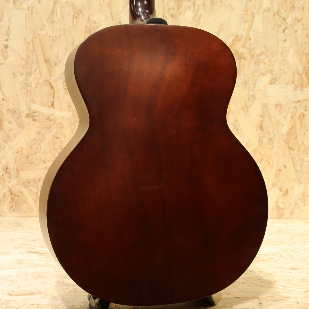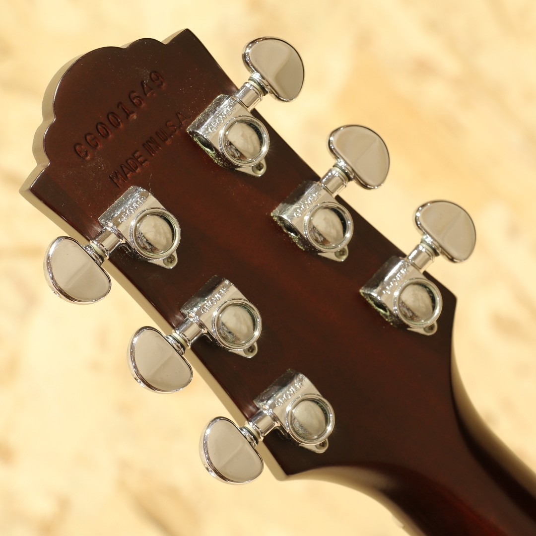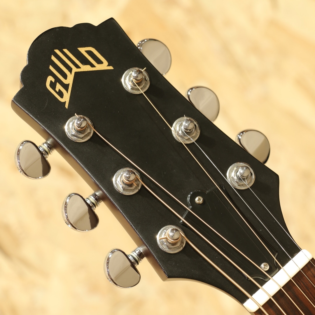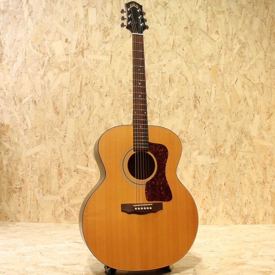 かつてのアコースティックギター御三家ブランドの一つギルド。1952年、ニューヨーク・エピフォン時代の職人達により産声を上げたギルド・ギター。多くのミュージシャンと契約をし、表舞台で活躍するメイドインUSAの古き良きブランドとして名を馳せていました。"Paul Simon (ポール・サイモン)やJohn Denver (ジョン・デンバー)、Nick Drake (ニック・ドレイク)等、数多のフォークシンガー達が愛したギターブランドです。本器は、本ブランドを象徴するオリジナルジャンボボディにラウンドバック仕様を持った"JF-4E"。1994年製USED品。スプルーストップ、マホガニーサイド&アーチドバック、マホガニーネック、ローズウッド指板&ブリッジ、GROVERロトマチッククロームペグ、べっこう柄ピックガード、ノンスキャロップドXブレイシング、アンダーサドルピエゾピックアップ搭載。ギルド特有のクリアで無骨なサウンドを持ちながら、現代に通じる煌びやかで広がりのあるサウンドレンジを併せ持つギターです。ハリのある太い音色を持ち、ピッキングのタッチ次第では甘いサウンドからはきはきとした明瞭なサウンドまで対応できるポテンシャルを持つ1本。ノンスキャロップブレイシング特有のコシのあるトーン、アーチドバックが生み出す弾むようなサウンドはマホガニーらしいカラッと響く快活なトーンとの相性は抜群です。ピックアップは定番アンダーサドルピエゾシステムのアクティブタイプ。コントローラーのないシンプルなシステムでアンダーサドルピエゾらしい芯のある明瞭なラインサウンドをアウトプットします。バック面に薄いバックル傷、6弦側サイド面に塗装内部が反応したような箇所が見られますがご使用に影響はありません。その他、表面上の小傷等は見られますが経年使用を思えばキレイな状態が保たれており、割れ修正もありません。ネックコンディションも良好、演奏性、操作性もともにGood。エレアコ仕様ですのですぐにでもステージでお使いいただける即戦力のUSAギルド。是非ご検討ください。オリジナルハードケースが付属します。