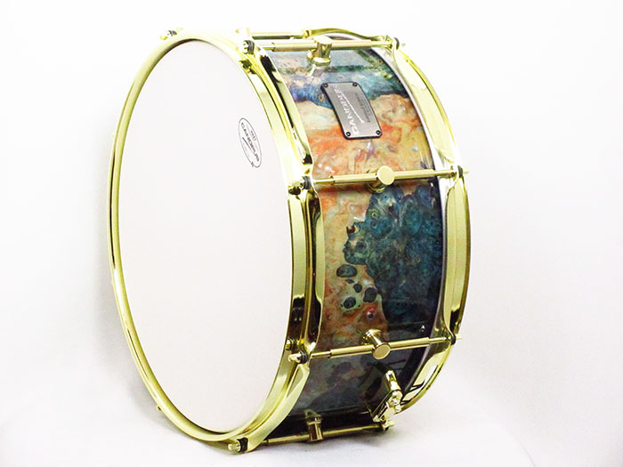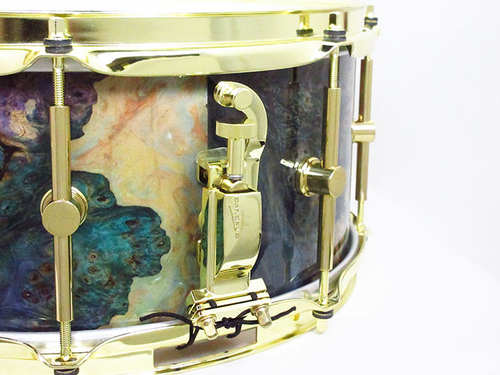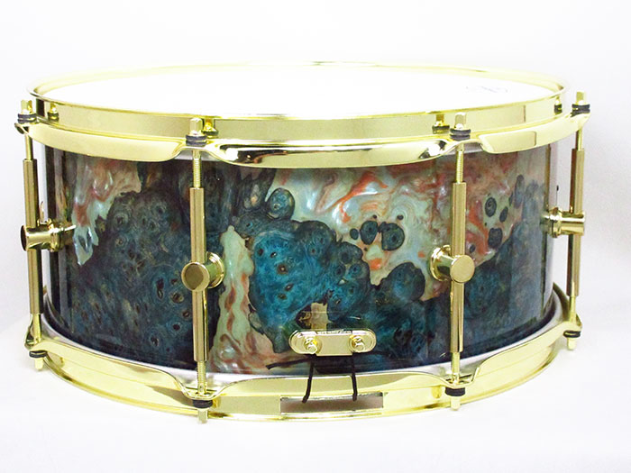 高級材と特殊樹脂を加圧真空鋳造して数センチ厚の板材を構築。さらに、1mm厚にスライス成型したハイブリッド材をフィニッシュプライに使用し、メイプル材と組み合わせてシェル成型し、クリアラッカーで仕上げました。