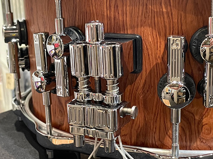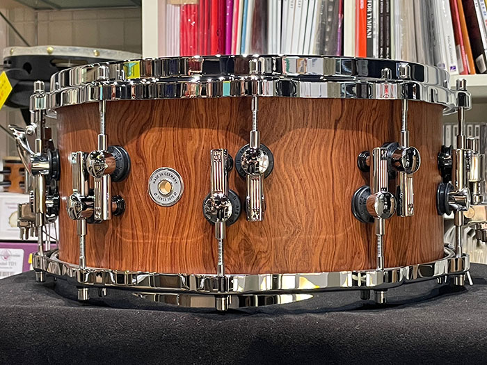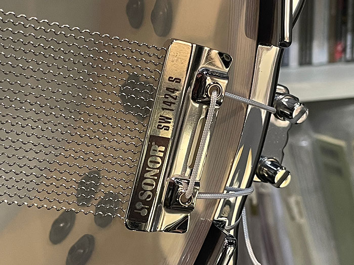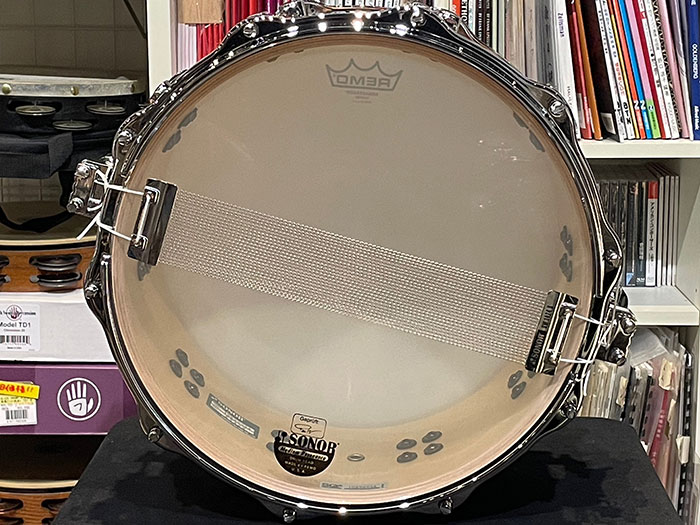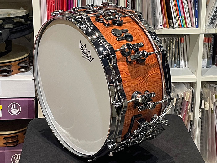 シグネイチャーバーチシェルを彷彿するかのような分厚いバーチヘヴィシェルは、メイプルにはないフルショット時にでる強烈なアタック感と深々と広がる低音に感極まるかと思われます。深さを6.5インチに設定することによりさらなるレゾナンスを増幅させます。勿論ながらスナッピーの反応も速く奇麗な粒立ちはソナードラムならではです。最強のスネアとはこのことではないでしょうか。