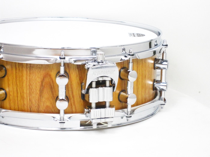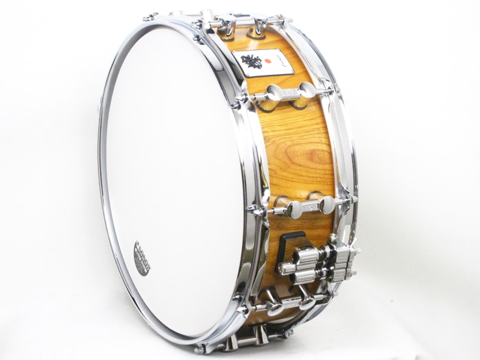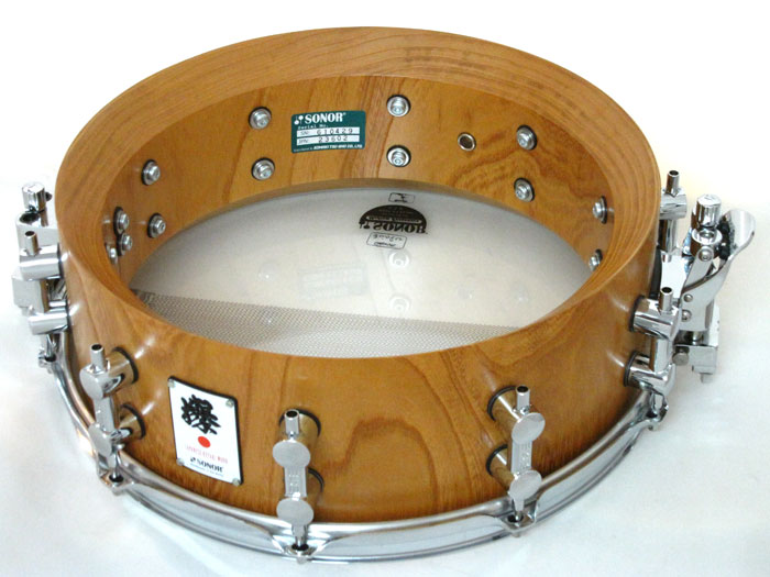 和太鼓の伝統的な刳り貫き工法と日本原産の最高の木材、そしてソナー社の技術力を掛け合わせ、特別なスネアドラムを作る。というコンセプトのもと、様々な樹種より試作を繰り返し終に辿り着いたのがこの「欅-KEYAKI WOOD-」スネアドラムでございます。