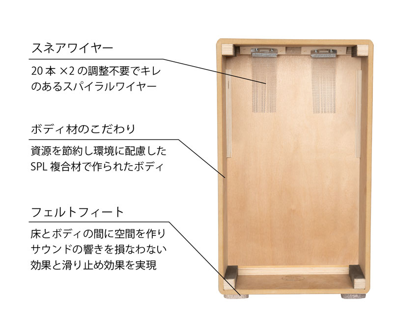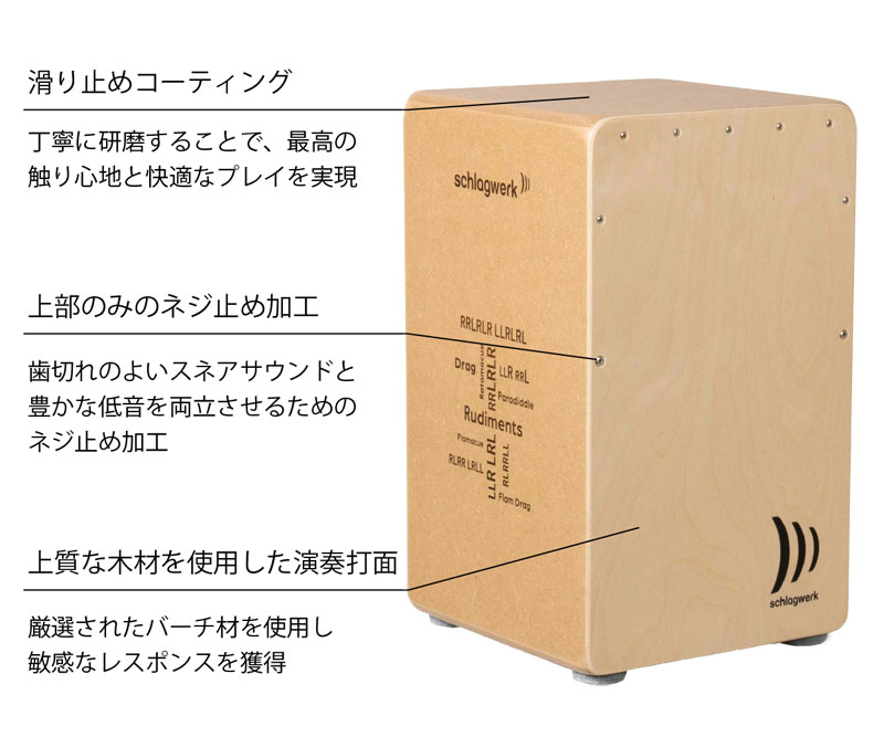Rudimentsシリーズは、 持続可能なSPLボディによるX-Oneシリーズの生態学的後継者です。 この資源効率の良いカホンは、 持続可能な素材の組み合わせから魅力的なモダンなデザインを提案します。 ベースとスネアの明確な分離、敏感なレスポンス、そして力強いパンチは、初心者向け楽器カテゴリの基本となるような願いを込めて、私たちは「Rudiments」と名付けました。 ●SR-CP90 サイズ:30x30x50 cm 打面材:ヴィンテージウォルナット合板 側面材:SPL 響き線:スパイラル20線x2