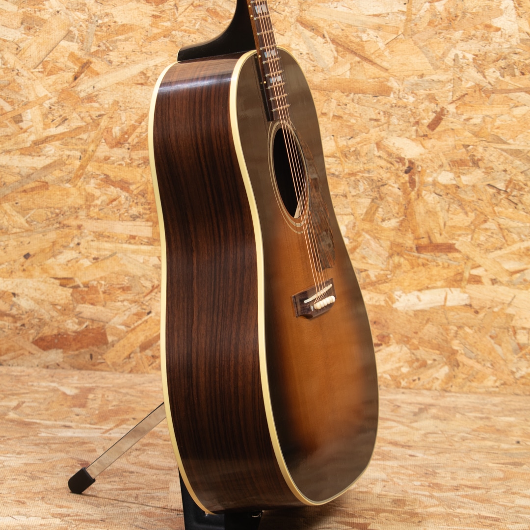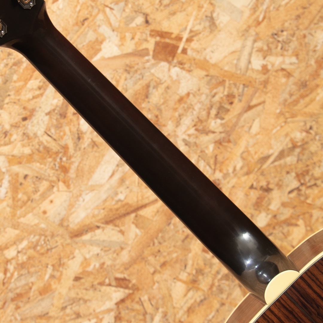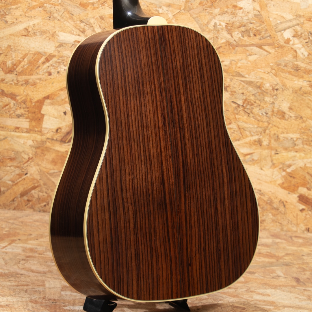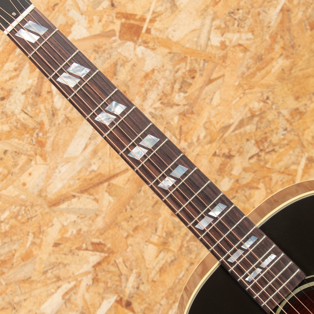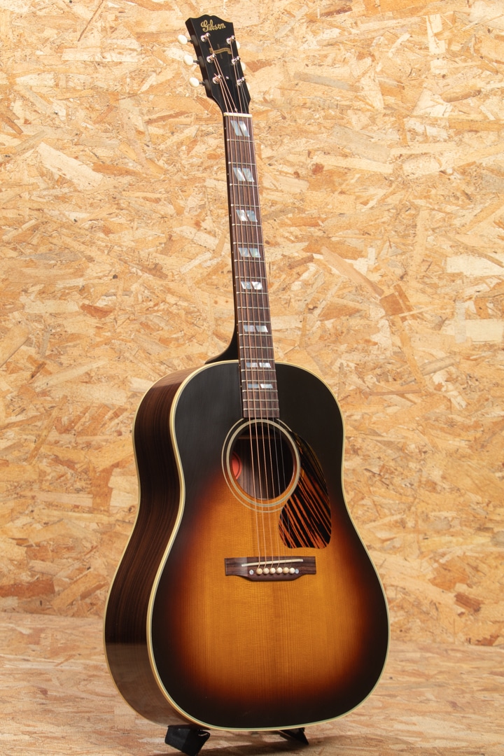 ギブソン代表機種の内の1つ”サザンジャンボ”。”J-45”の兄弟機種、上位機種とも呼ばれ、ルックス、サウンドともに”J-45”よりもゴージャスさ、華やかさがあり、1942年に登場して以来、今もなお世界で愛されて止まないフラットトップにおける人気モデルのひとつです。本器は発売開始初年度1942年を再現した復刻したモデル。"1942 Banner Southern Jumbo”。サーマリーエイジドアディロンダックレッドプルーストップ、ローズウッドサイド&バック、マホガニーネック、ローズウッド指板、極初期に見られるアダウンベリーのローズウッドブリッジにロングサドル、ストライプピックガード、ダブルパラレログラムMOP指板インレイ、バナーヘッドにオープンギアニッケルチューナー、音の伝達に優れたニカワ接着にシンラッカーフィニッシュのVOS仕上げなどヴィンテージフレーバー溢れる拘りの仕様です。ネックはナット幅こそ44.95mm幅とやや幅広ですが厚みはそれほどでもなくベースボールバットと呼ばれるオリジナルの極太ではなく現代的なアレンジとなっているところも嬉しい所です。これまでマホガニーサイドバックをベーシックとした1942年仕様のモデルはいくつかありましたがローズウッドを使用したモデルはなく、このギターでしか味わえない独特の重厚さは格別です。タッチレスポンスよく軽やかな反応を示しながらモタついた感じがなく、レンジ感は広くなりながらも薄い音像ではなく全弦太く芯が強くしっかりと出ています。ローエンドのたくましさを感じる重厚な響きはJ-45と異なる凄みすら感じる事ができます。新しいギターながら弾き込まれたかの様なパワフルで気持ちの良いサウンドをぜひお手元でご体感下さい。オリジナルハードケース付属。