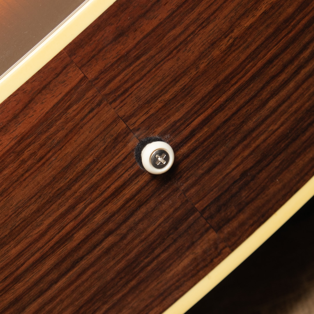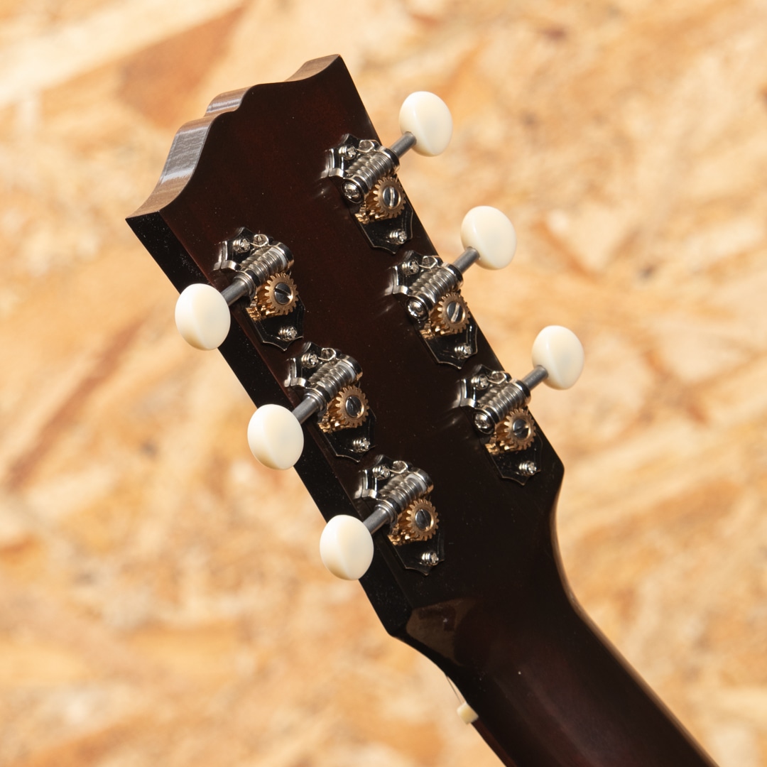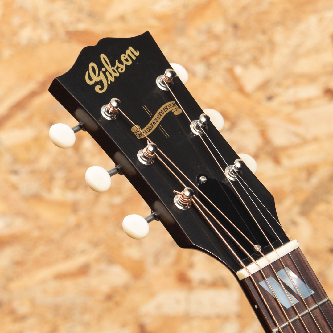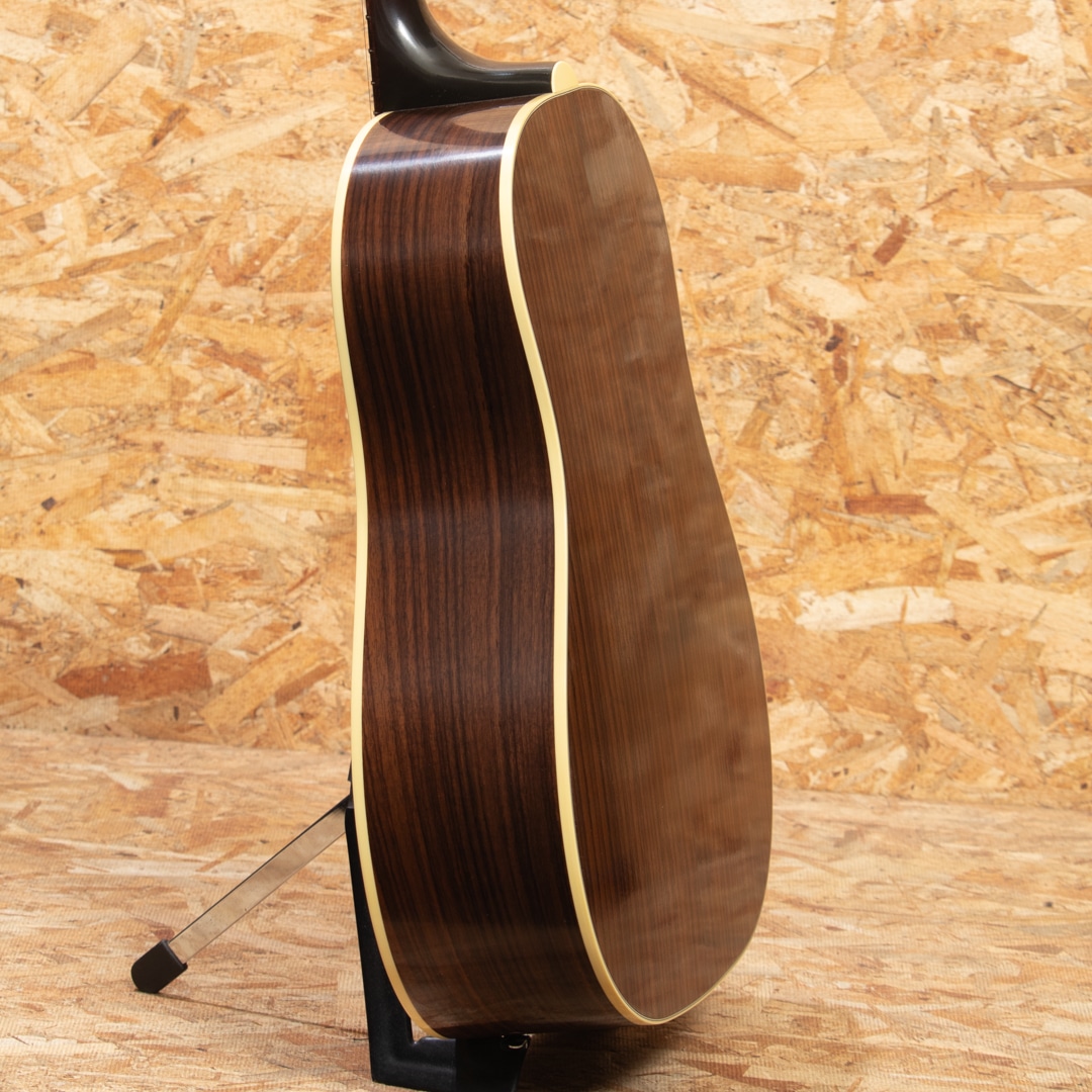 ギブソン代表機種の内の1つ”サザンジャンボ”。”J-45”の兄弟機種、上位機種とも呼ばれ、ルックス、サウンドともに”J-45”よりもゴージャスさ、華やかさがあり、1942年に登場して以来、今もなお世界で愛されて止まないフラットトップにおける人気モデルのひとつです。本器は発売開始初年度1942年を再現した復刻したモデル。"1942 Banner Southern Jumbo”。サーマリーエイジドアディロンダックレッドプルーストップ、ローズウッドサイド&バック、マホガニーネック、ローズウッド指板、極初期に見られるアダウンベリーのローズウッドブリッジにロングサドル、ストライプピックガード、ダブルパラレログラムMOP指板インレイ、バナーヘッドにオープンギアニッケルチューナー、音の伝達に優れたニカワ接着にシンラッカーフィニッシュのVOS仕上げなどヴィンテージフレーバー溢れる拘りの仕様です。ネックはナット幅こそ44.95mm幅とやや幅広ですが厚みはそれほどでもなくベースボールバットと呼ばれるオリジナルの極太ではなく現代的なアレンジとなっているところも嬉しい所です。これまでマホガニーサイドバックをベーシックとした1942年仕様のモデルはいくつかありましたがローズウッドを使用したモデルはなく、このギターでしか味わえない独特の重厚さは格別です。タッチレスポンスよく軽やかな反応を示しながらモタついた感じがなく、レンジ感は広くなりながらも薄い音像ではなく全弦太く芯が強くしっかりと出ています。ローエンドのたくましさを感じる重厚な響きはJ-45と異なる凄みすら感じる事ができます。新しいギターながら弾き込まれたかの様なパワフルで気持ちの良いサウンドをぜひお手元でご体感下さい。オリジナルハードケース付属。
