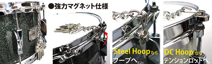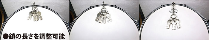 マグネット式なのでon/offも素早くできます。例えばサビ前の1小節ドラムフィルインでon!出際にoff!みたいな使い方もできたり、アイディアは広がりますね。鍵までの形状が鎖になってるので素早く距離も変えられます。浅く当てれば鍵が「リン」と鳴ってくれるし、深く当てればコンプで歪ませた様な音も作れます、リムショットと併用するとより強調されたり、ドラマーそれぞれのタッチによってより個性のある音が生まれてくると思います。 特徴の有る音ではありますが色々な音楽のジャンル、場面にもスッと馴染んでいくと思います。是非楽しんで使っていください!」