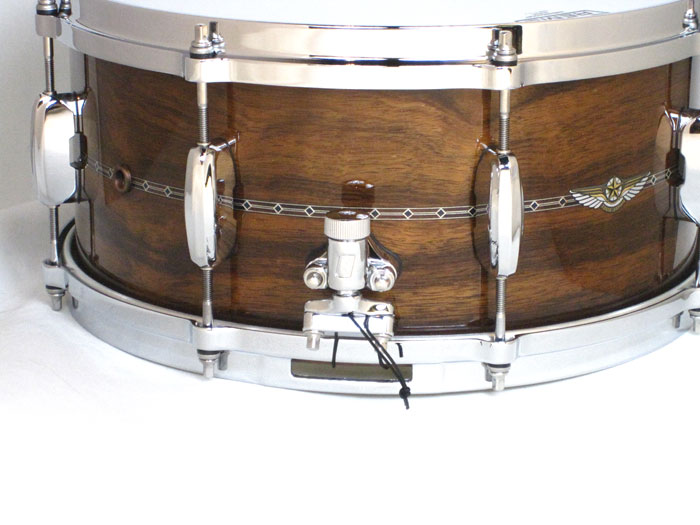新しくデザインされたラグは、小ぶりなデザインを採用しシェルとの接触面を可能な限りまで小さくしたブリッジタイプです。小さめのラグにすることで、スネアドラム本体の重量を軽くするとともに、パーツ点数を少なくすることでシェル本来のもつポテンシャルをよりオープンに、かつレゾナンス豊かにします。