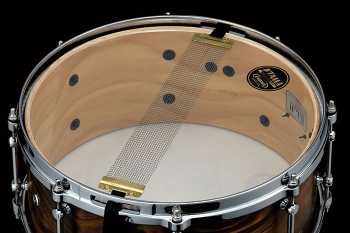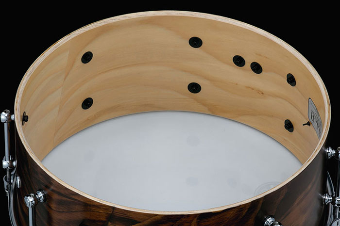 アコースティックギターのトップ材として使われることの多い、スプルースをシェル材に使用したスネアドラム。中・高音域の倍音と振動特性に優れており、ファットでウォームなサウンドとレゾンナンス豊かな鳴りを実現します。
