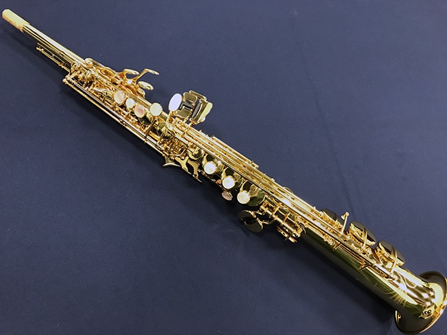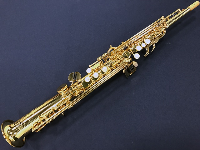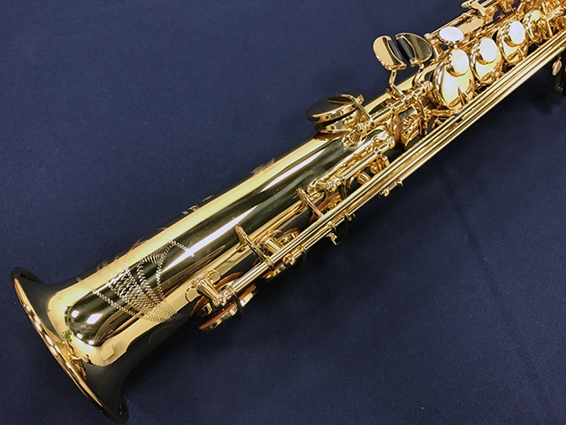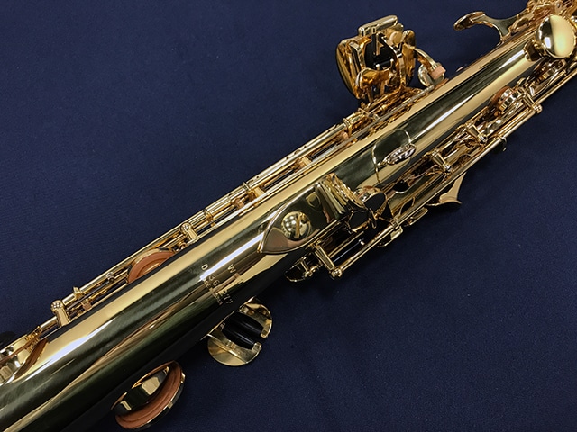 管体:イエローブラス製ラッカー仕上げ/キィ:真鍮製ラッカー仕上げ/金属製サムレストサムフック/硬質製バネ/C#~B連動テーブルキィ/High F#キィ付/エボナイト製マウスピース付き/彫刻付き
