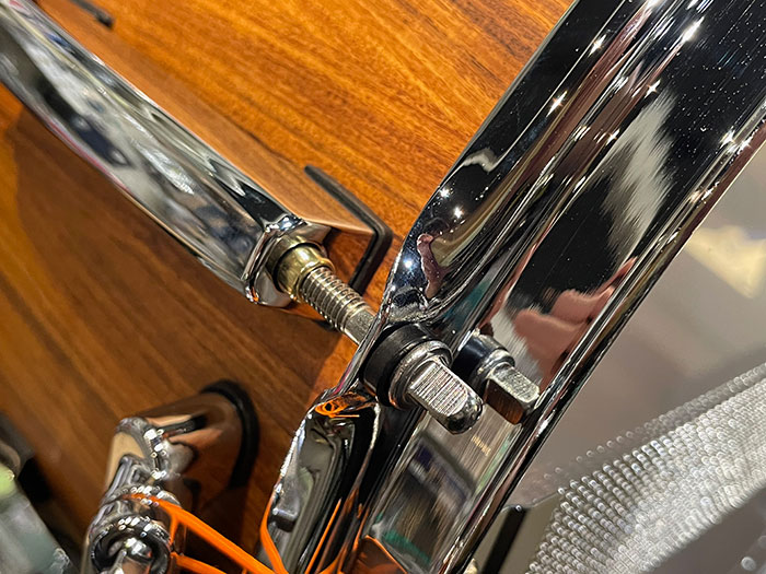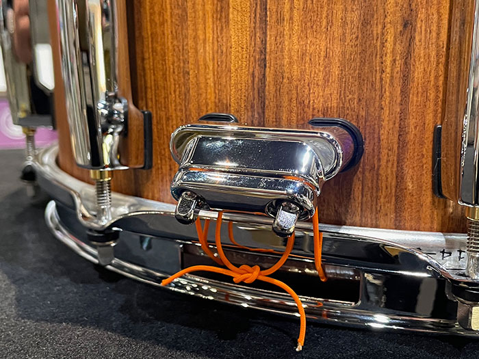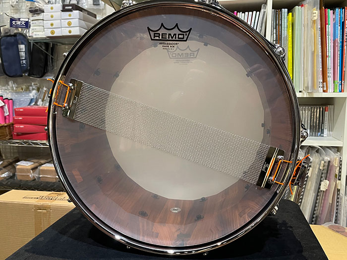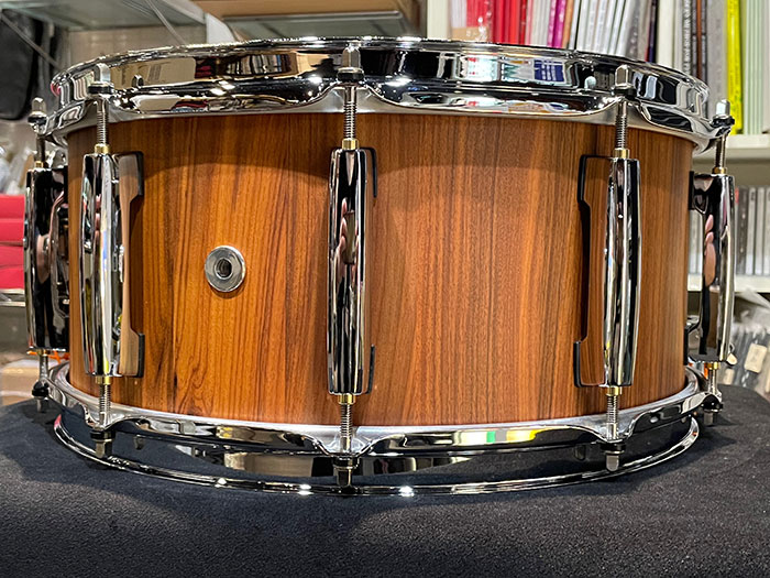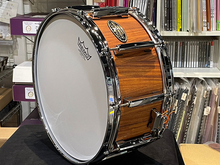 長年の熟成期間を経て十分に乾燥させた素材から、厳しい選定基準により高品質で安定した部分を選び、極厚(30mm)のブロック状に加工。それらを同素材のペグで連結させ、歪みのない極めて真円で強度を高く仕上げたシェルは、ソリッドかつ重厚で、圧倒的な音圧と音量を生み出します。そしてそれぞれの素材特有のサウンドをさらに引き出すために、できる限り塗装を薄く(*)したフィニッシュとし、オープンな鳴りに貢献したするパーツ群を装備することで、見事なまでのセンシティブなレスポンスに加え、フォルテシモでもツブ立ちのよい、ブライトな音色を発揮します。さらにD-FlavorのJapanアッセンブリーによりブラスフープを搭載、音の伝達率を極限まで引き上げローズウッドブロックシェルの最高の音を提供いたします。