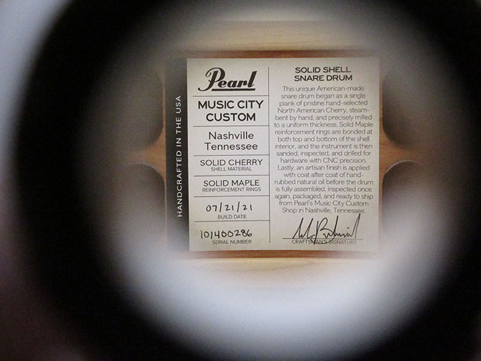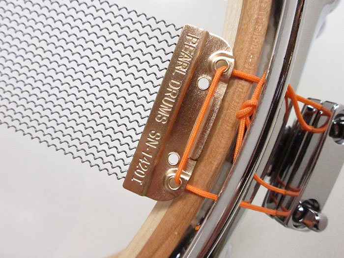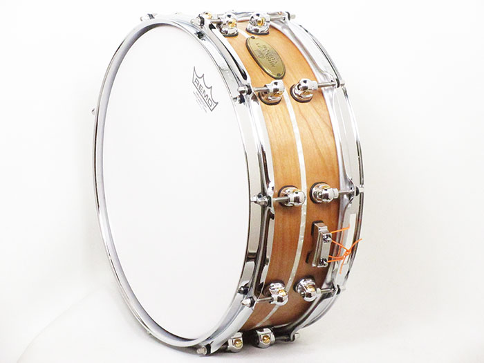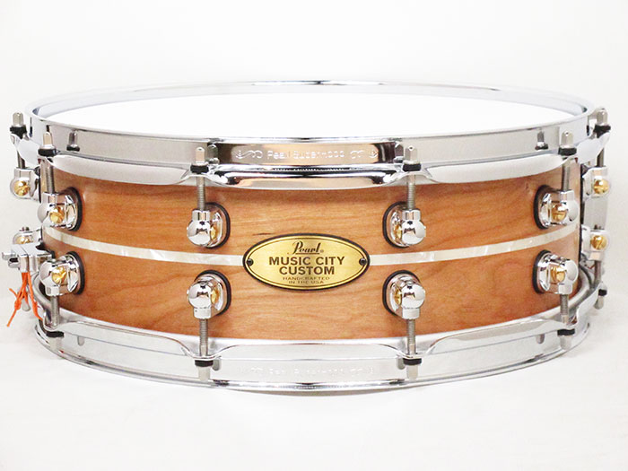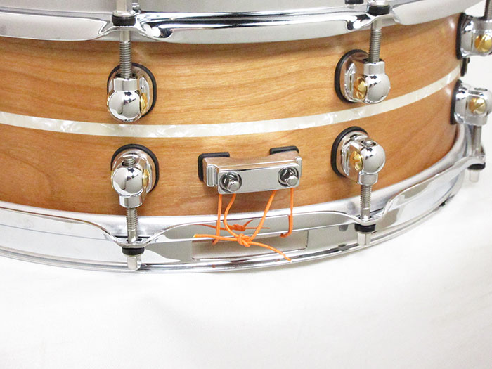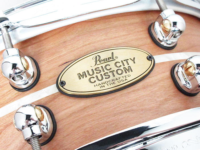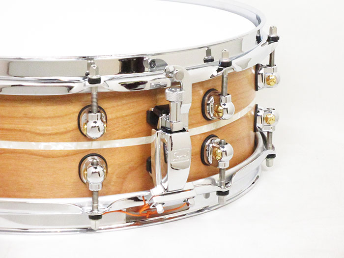 これらのスネアドラムは全て単板(Solid)のシェル(*)で深胴(6.5”)と浅胴(5”)の2サイズをラインナップし、素材は代表的なメイプルの他に、チェリー、ウォルナット、アッシュの計4種類から選択でき、全てのシェルにメイプルのレインフォースメントが装備されています。穴あけから塗装、組み上げ迄の工程を全てパールU.S.Aで行い、とりわけ、ヴィジュアルにも影響のあるインレイは7種類あり、さりげなく個性を主張しているのもポイントです。