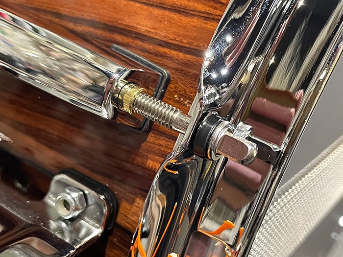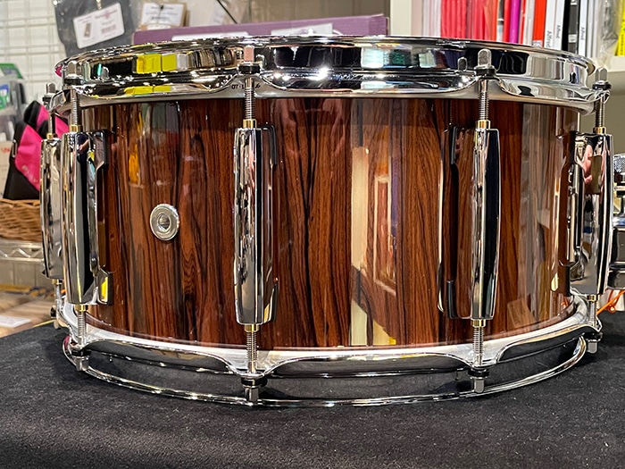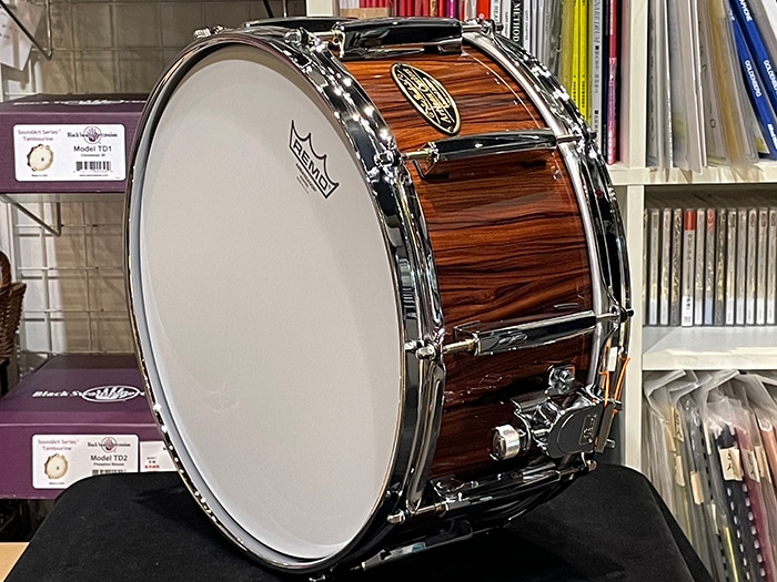 長年の熟成期間を経て十分に乾燥させた素材から、厳しい選定基準により高品質で安定した部分を選び、極厚(30mm)のブロック状に加工。それらを同素材のペグで連結させ、歪みのない極めて真円で強度を高く仕上げたシェルは、ソリッドかつ重厚で、圧倒的な音圧と音量を生み出します。そしてそれぞれの素材特有のサウンドをさらに引き出すために、できる限り塗装を薄く(*)したフィニッシュとし、オープンな鳴りに貢献したするパーツ群を装備することで、見事なまでのセンシティブなレスポンスに加え、フォルテシモでもツブ立ちのよい、ブライトな音色を発揮します。さらにD-FlavorのJapanアッセンブリーによりブラスフープを搭載、音の伝達率を極限まで引き上げローズウッドブロックシェルの最高の音を提供いたします。