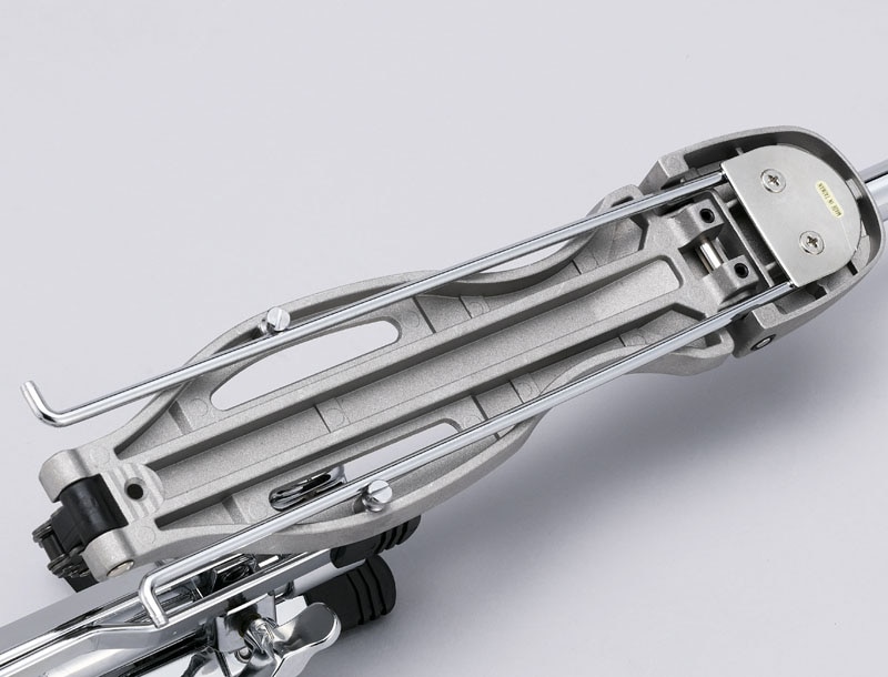 下段パイプの表面の一部に施されたローレット加工は、脚部を開閉する三又部との摩擦を増やして滑りにくくするためのひと工夫。プレートを踏み込んだ際でも、三又部が滑ることを防ぎ、スタンドを常に安定させる効果があります。