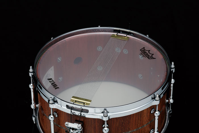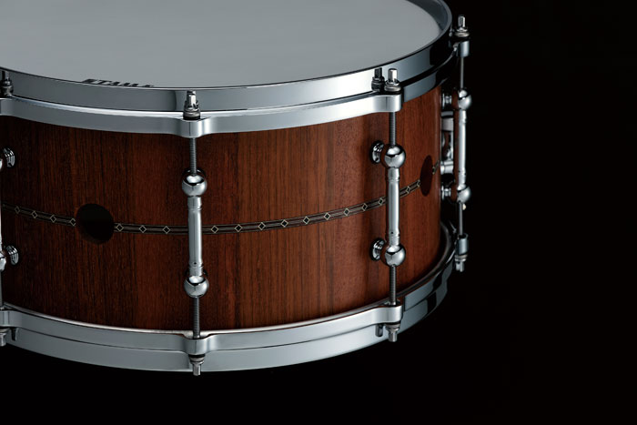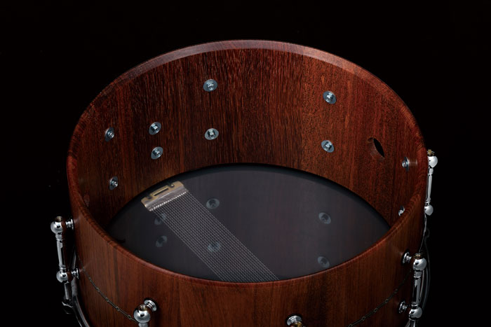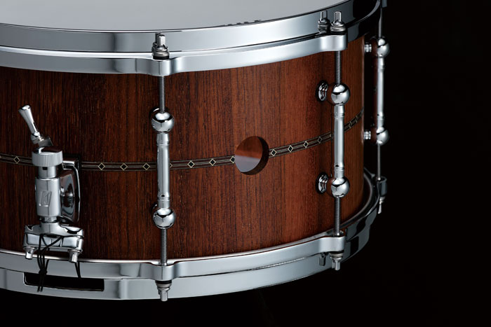 そのスネアを目にした時に最初に飛び込んでくる、14”x7”というボリューム感のあるサイズと、力強い印象 を与えるダイキャストフープ。そして、側面に空けられた28mm径のサウンドホール。その荒々しく猛り狂 う荒波のような力強いルックスのイメージとは裏腹に、サウンドはメロウで甘く、ボリューム感溢れる響き が特徴です。 無骨な印象を与える赤褐色のシェルは、熱帯地方を原産とするジャトバ材によって丁寧に作られた10mm厚 のブロックを、一つひとつ円形に16個並べたステイヴ・シェル。植物中の水が通る通り道である導管が強く 現れるため力強いイメージを与えるものの、その独特のシェル構成がもたらすサウンドはあくまでも甘く、 温かく、そして高級感の溢れるファットな鳴りを響かせます。 また、シェルの側面に空けられた3つのサウンドホールは、得てして硬質なだけになりがちなジャトバの響き をコントロールするために綿密に設計された28mm径という仕様。空気の通り道を通常よりも多くすること で、硬く重厚なだけではない甘くメロウなジャトバの響きを引き出します。一方、スナッピーは絶妙な吸い 付きと歯切れの良い響きが持ち味のSuper Sensitive Hi-Carbon Snappyを採用。適度に張り感を加えるこ とで、シェルのボリューム感のある響きを活かしつつ、くっきりとした音像を創出します。 高めのテンションでも充分な存在感を発揮しますが、特にミディアムからローピッチにかけてしっかりと現 れる甘く豊かなシェル鳴りは、見た目とは裏腹に温かくドラマーを包み込むような極上の包容力を発揮します。