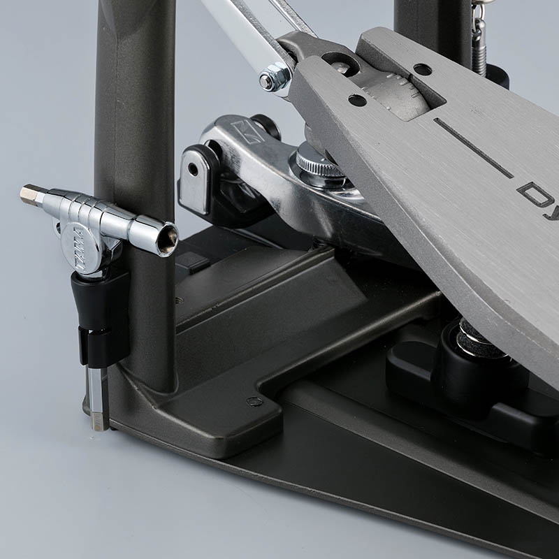 ドラマーそれぞれ個人の好みにカスタマイズするために重要な機能が、ビーターアングルとは独立したフットボードアングルの角度調整。Dyna-Syncペダルは、これまでに無い新しく、ユニークな角度調整機能を搭載しています。フットボードの先端に、カムから伸びたリンケージを繋ぐクランプがあり、そこに設けられたボルトをチューニングキーで調整することで、フットボード全体の角度を変更し、かつ強固に固定することができます。