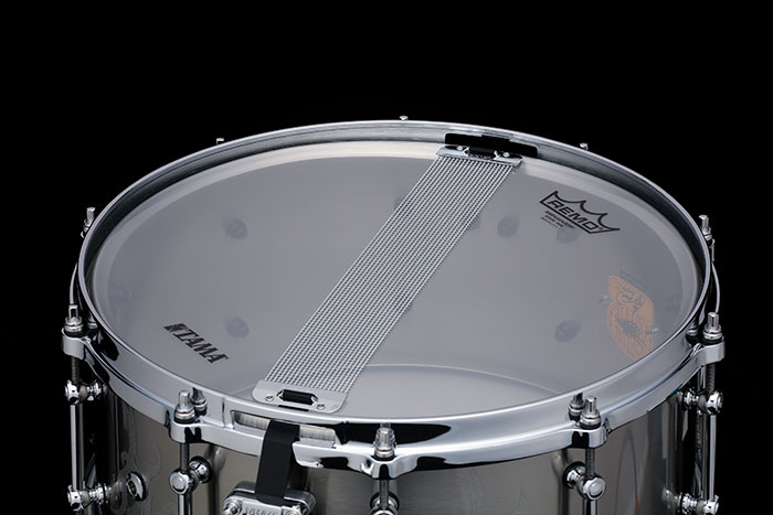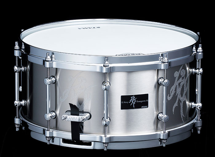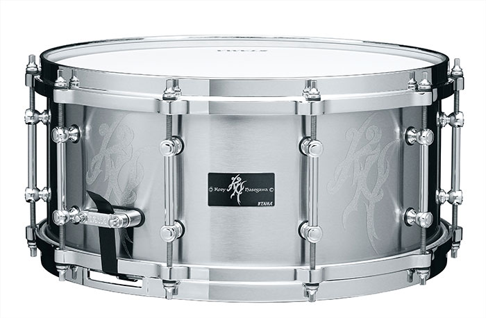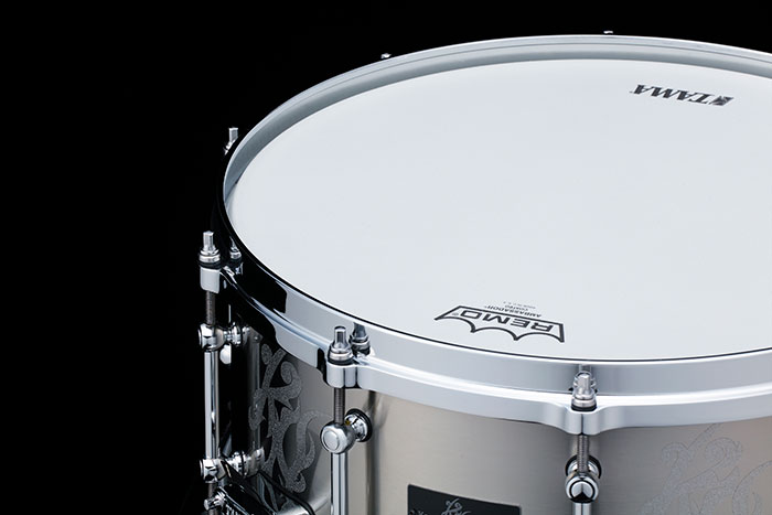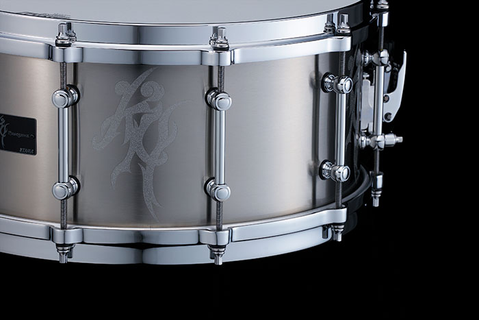 このスネアドラムで長谷川浩二が強く要望したのは、「荒々しく、無骨なまでのパワフルさ」、「とにかく音抜けに秀でたメタルシェル」、そして「外観もメタル シェルらしさを前面に出したデザインであること」という3つ。企画の立ち上げから数年の月日を経て、数多くの試作とロードテストの果てに完成したこのモデ ルは、これら3つの要望を余すところなく実現した渾身の1台となっています。