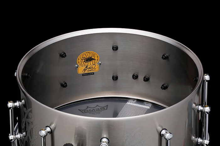 S.L.P.シリーズのスネアドラム、Sonic Stainless Steel (LSS1465)と同様の1.2mm厚のステンレススティールシェルを 採用。重厚なシェル鳴りと、芯のある音抜けを実現します。シェ ルの内面には、直筆サイン入りのステッカーが貼られています。
