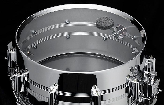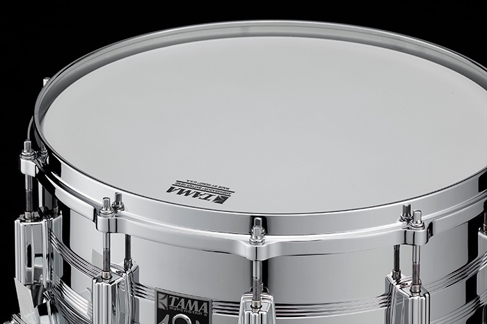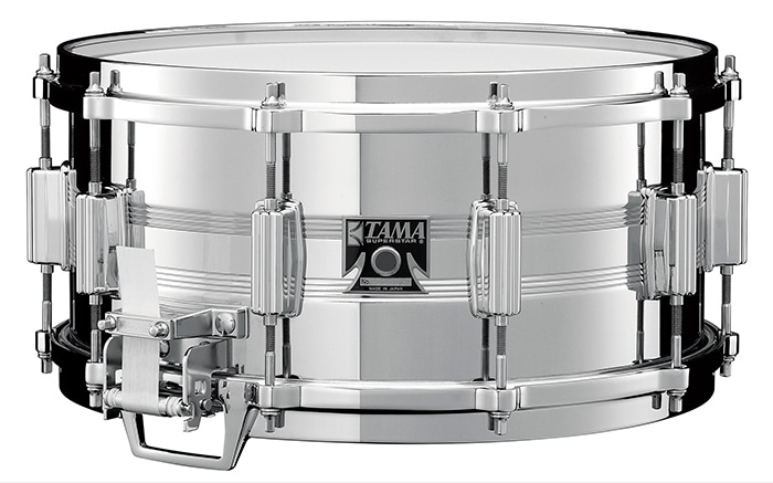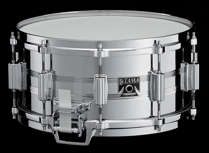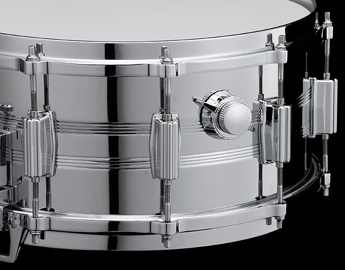 多くのブランドからスチールシェルのスネアドラムは発売されていましたが、通常よりも厚い 1.2mmシェルを採用することで、ヘビーかつパワフルなアタックが特徴的なサウンドを実現した モデルはまさにロックドラマーの求めていた音でした。特徴的なシェルの8本ライン模様も再現
