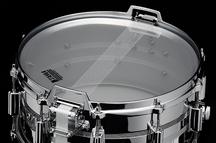 当時の仕様をそのまま再現した、全面当たり方式の18本線カーボンスチールスネアワイヤー &フィラメントテープを採用。内面当たり方式と比較して、スネアワイヤーのみが裏面ヘッドに接 するため、よりセンシティブな反応が得られます。