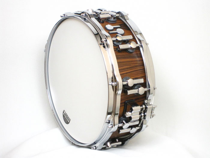 このスネアは分厚いメイプル材のシェルに、ローズウッドの化粧板を施した豪華な仕様となっております。また化粧板をアウト&インサイドに施す事により、引き締まり立ち上がりが良く存在感抜群のサウンドとなっています。またフォニックシリーズと同様のシェル材を受け継ぎ、調和感の中に自然と溶け込むシンフォニックなサウンドはクラッシックなスタイルから吹奏楽まで多彩な表情で奏でます。
