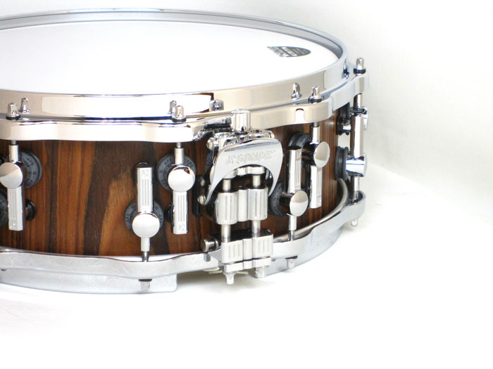 このスネアは分厚いビーチ材のシェルに、ローズウッドの化粧板を施した豪華な仕様となっております。また化粧板をアウト&インサイドに施す事により、引き締まり立ち上がりが良く存在感抜群のサウンドとなっています。またフォニックシリーズと同様のシェル材を受け継ぎ、調和感の中に自然と溶け込むシンフォニックなサウンドはクラッシックなスタイルから吹奏楽まで多彩な表情で奏でます。