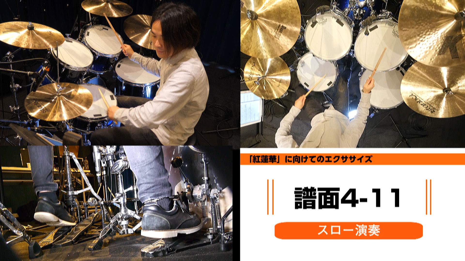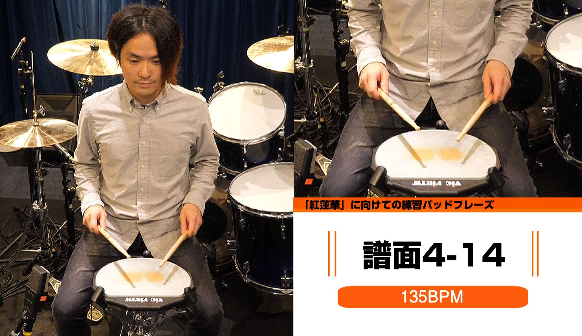 曲を叩くための1.基礎リズムパターン→2.基礎フィルイン→3.エクササイズ→4.練習パッドフレーズ→5.目的の曲を叩くという5STEPトレーニングで楽しみながら上達できます。