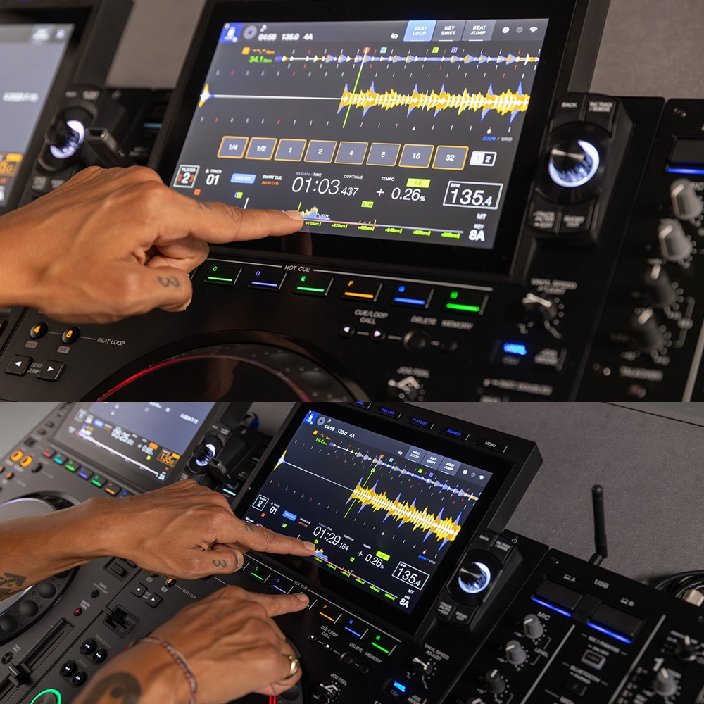CDJ-3000Xは、HOT CUE機能をさらに進化させ、新しいパフォーマンスワークフローを提案します。スピーカーから再生中の楽曲に影響を与えることなく任意のポイントをヘッドホンで試聴できるTOUCH CUEは、CDJ-3000で好評を得た機能です。CDJ-3000Xでは、このTOUCH CUEで試聴したポイントに、そのままHOT CUEを設定できるように進化しました。事前準備がなくても、その場で展開を確認しながらHOT CUEを仕込むことができ、即興的なパフォーマンスに対応します。