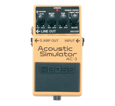 AC-3は、モード・スイッチにより4種類のアコースティック・ギター・サウンドを選ぶことができます。定番ともいえるドレッドノート・タイプのSTANDARD、大きなボディで豊かな低音域と美しい高音域に特徴があるJUMBO、アタック感を強調することによってバンド・アンサンブルのなかでも他の楽器に埋もれない存在感を主張できるENHANCE、そして、ラウンド・バック構造でピエゾ・ピックアップによるサウンドが特徴的なPIEZOで、好みのアコースティック・ギター・サウンドを手に入れることができます。