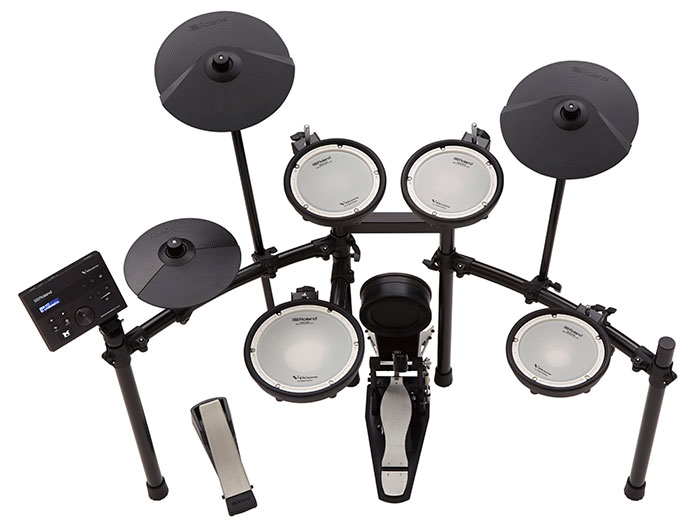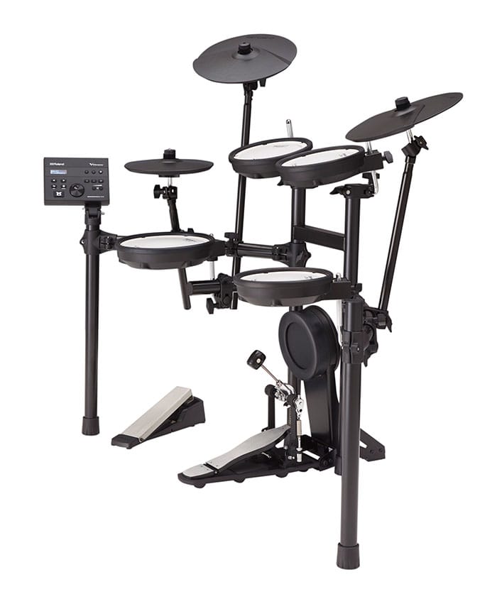TD-07KV は、コンパクトながらも優れた表現力と演奏性を提供する、自宅での使用に最適な V-Drums です。スネアとタムには静粛性に優れた独自のダブル・メッシュ・ヘッドのパッド、クラッ シュとライドにはショット時の独特の動きを再現した 12 インチのシンバル・パッド、バス・ドラム には心地よい演奏感をもたらすキック・パッドを採用しています。