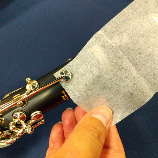 クリーニングペーパーを使用し、タンポやトーンホール(音孔)に溜まった水分・油分を取り除くことでタンポの寿命を延ばし、またトーンホールが割れるのを防ぐことが出来ます。