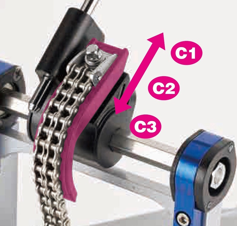ダブルチェーンドライブはペダルを踏み込むごとに均一にテンションがかかります。カムをC1・C2・C3へと変更する(画像をご参照ください)ことで、踏み始めのアクションを軽くするセッティングが可能です。