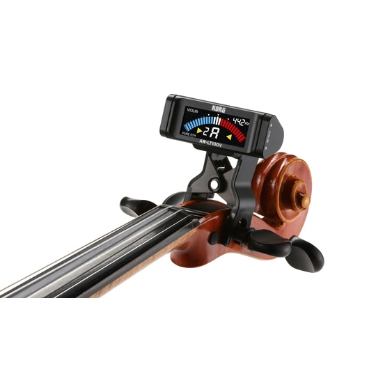 AW-LT100Vは、バイオリンやビオラのペグボックスへしっかり取り付けられる専用クリップを採用。視界の真正面でチューニング・メーターを捉えることができ、取り付けたままでも快適に演奏を行うことができます。また通常のクロマチック・モードの他に、純正5度でチューニングできるバイオリン・モード/ビオラ・モードを搭載。それぞれのモードでは音名の横に弦番号も表示し、確実で分かりやすいチューニングが可能です。