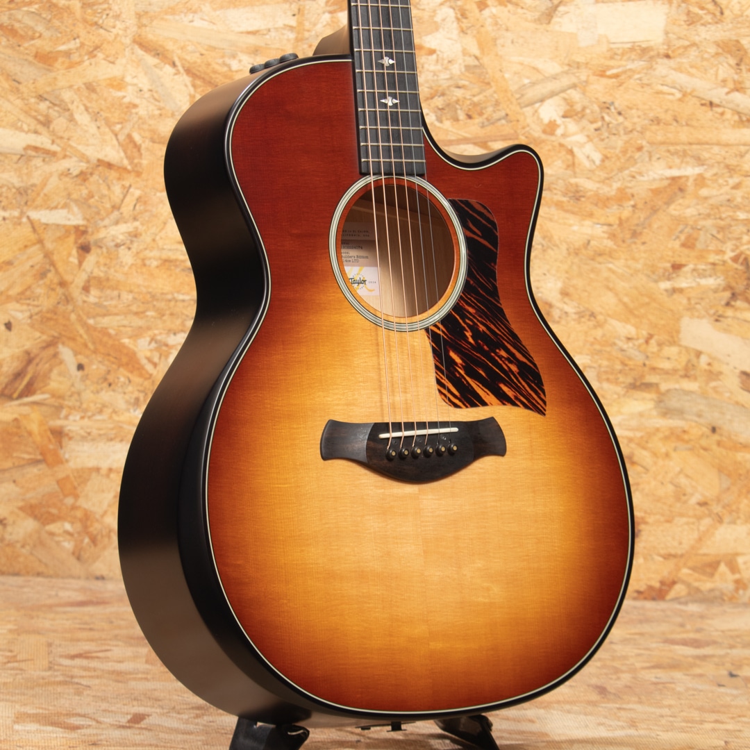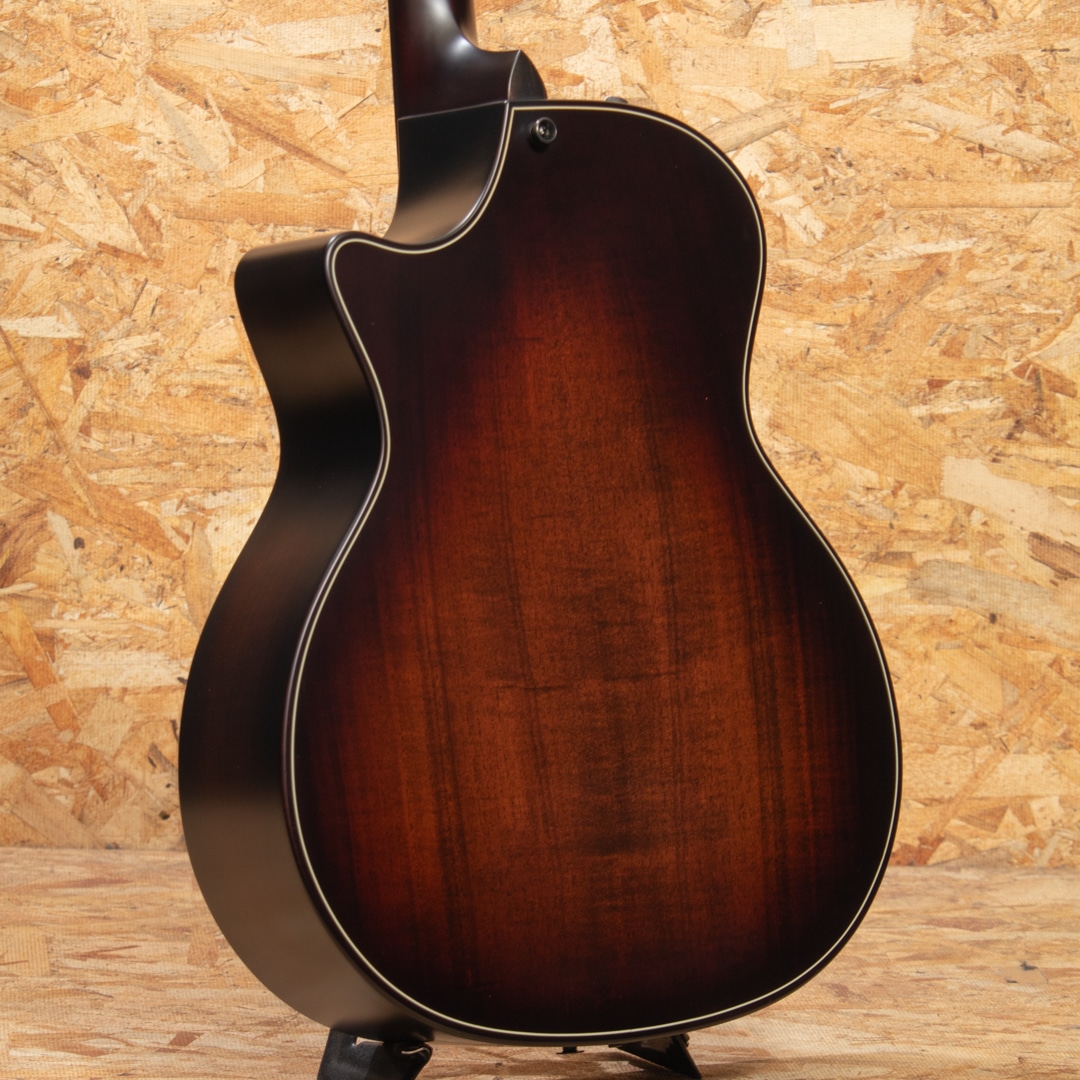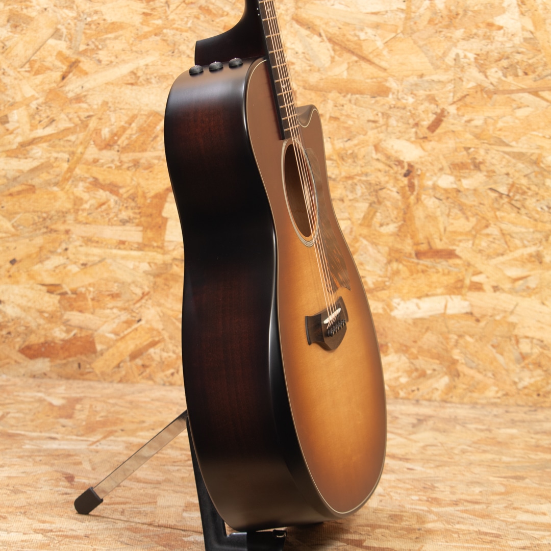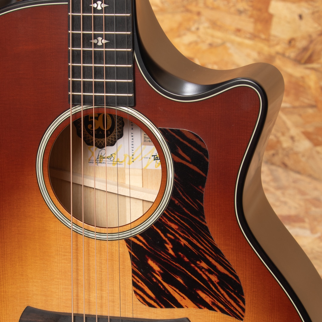 2000年代より急速に成長し画期的なギター構造を採用した事によって世界のトップアコースティックブランドに成長したテイラー社。国内をはじめ特に米国ではプロミュージシャン使用のシェアが高く、圧倒的な人気を誇っています。本器はテイラー・ギターズ創設50周年を記念したモデル”50th Anniversary Builder's Edition 314ce LTD”。スプルーストップ、アーバンアッシュサイド&バック、マホガニーネック、エボニー指板&ブリッジ、グランドオーディトリアムサイズボディー。トップ構造はV-Classブレーシングで力強さと強度、伸びやかなサスティーンをもたらしています。ES2 P.Uシステム搭載しアンプ接続時もナチュラルアコースティックサウンドを提供します。面取りされたボディーエッジに加え滑らかに加工されたベベルドアームレストとカッタウエイ部にもベベル加工が入りハイポジションへのアクセスも実にストレスなく演奏できます。ヘッドにはマザーオブパールのヘッドロゴ、Gotoh 510アンティークゴールドチューナー、ゴールドのアクリルドット入りブリッジピン、ボディー内部には50周年記念ラベルなど50周年を飾るにふさわしいゴージャスなルックスとなっています。サイド&バックに使用されているアーバンアッシュ材はTaylor社マスタービルダーのアンディ・パワーズ氏が高品質なホンジュラスマホガニーに匹敵する特性を有する次世代のトーンウッド材として新たに取り入れた材。温かみのあるウッディな声質ながら芯のあるクリアなサウンドはトーンに明瞭さを求めるフィンガーピッカーからシンガーソングライター、グループの中で音を際立たせたいプレイヤーにも適した多用途な1本に仕上がっています。オリジナルハードケース付属。