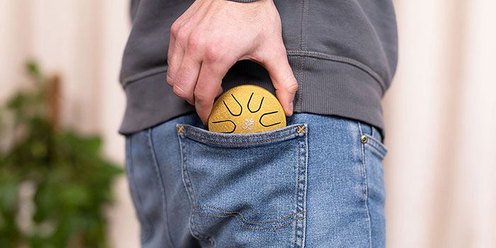 ポケットスチールタングドラムは、手のひらに乗る非常にコンパクトなサイズ(直径7.6cm)で、外出先、スタジオ、オフィスなどの場所を問わず、誰でもどこでも演奏することができます。穏やかな音色が心をなごませます。