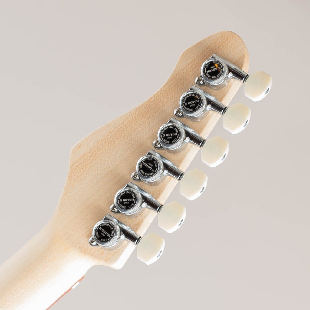 電子部分のみならず、厳選されたアルダーボディとメイプルネックは鳴り活かしたニトロセルロースラッカーを採用。特にネックは耐久性を高める為クォータソンメイプルに加え、指板サイドにはスキャロップ加工も施されており演奏面にも最大限の配慮が成されております。その他にも設置面積を広くとった3点止めジョイントやロッキングチューナー、摩耗にも考慮されたステンレスフレット等、細部に豊富な経験と技術が凝縮された至高のハンドメイドギターでございます。