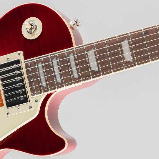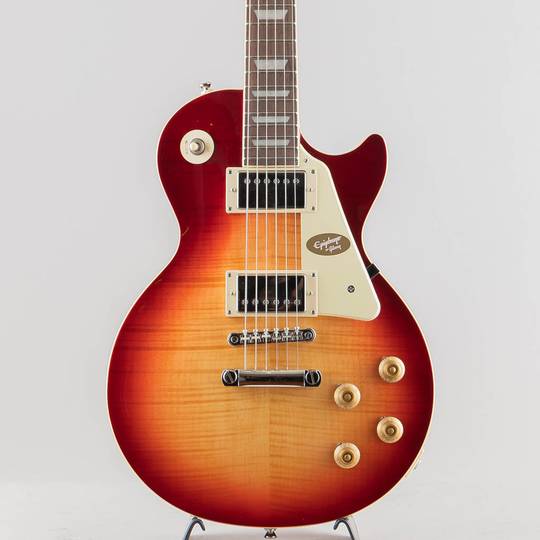 エピフォン・レスポール・スタンダード50sは、グロス仕上げのボディにメイプルトップ(フィギュアドトップのモデルにはAAAグレードのフレイム・メイプル化粧板)の材構成をもち、ロング・ネック・テノン仕様でジョイントされた50sシェイプ・ネック、クラシカルなディッシュ・インレイが施されたインディアン・ローレル指板、新開発のヴィンテージ・デラックス・チューナー、定評のあるエピフォンProBuckerハムバッカー、ダイヤル・ポインタ付きのゴールド・トップハット・ノブなど、充実の仕様群を誇ります。