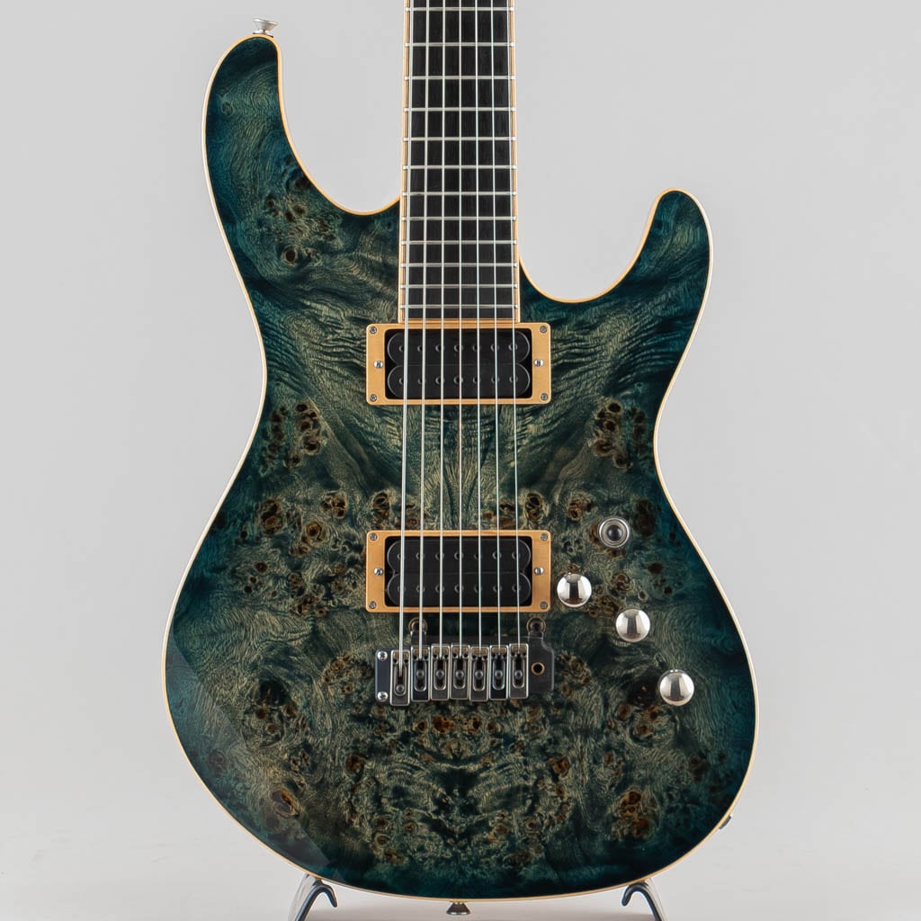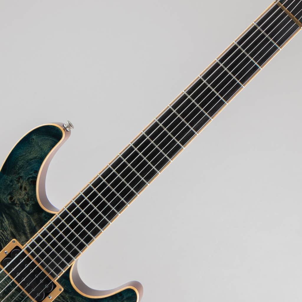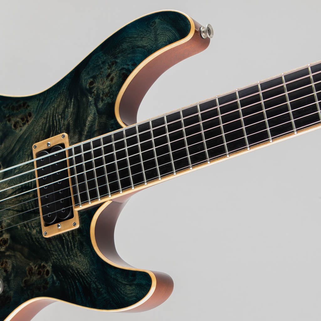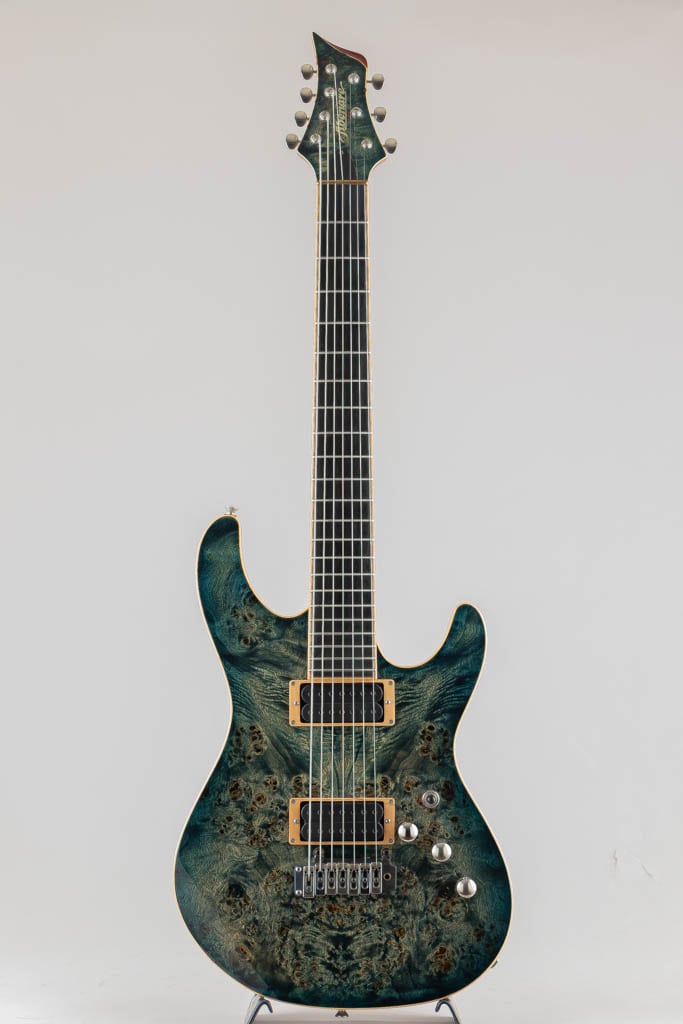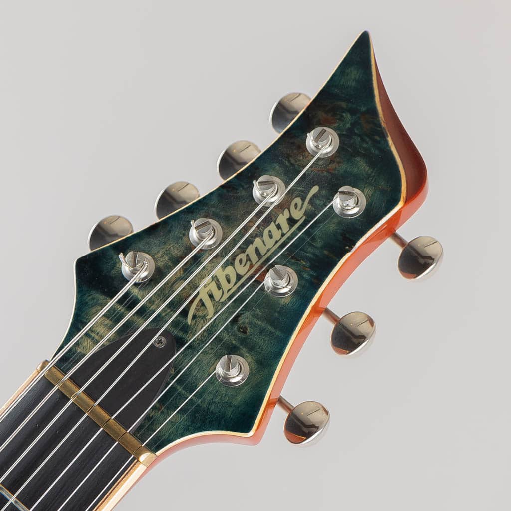 本機はPoplar burl Topのインパクトのあるルックスが特徴の7弦オーダーモデルです。fibenareらしいエキゾチックウッドを用いた美しいデザインに目が行きがちですが、演奏性においても特筆すべき完成度を誇っております。コントロールには特徴的な3way rotaryを搭載しており、洗練されたルックスながらも非常に幅広い音色を網羅。弾き手の創造性を妨げないポテンシャルの高さを持っています。ピックアップにはFibenareオリジナルのALV56を搭載。ほど良いコンプ感と煌びやかな高音域を併せ持ち、7弦モデル特有の唸るような低音域においても分離が良く、バンドアンサンブルにおいても埋もれず前に出てくるサウンドとなっております。
