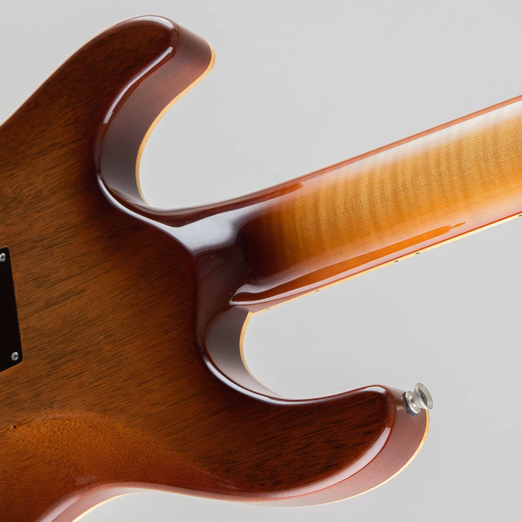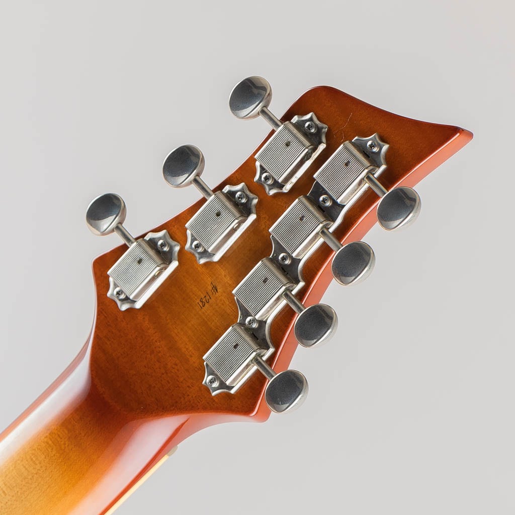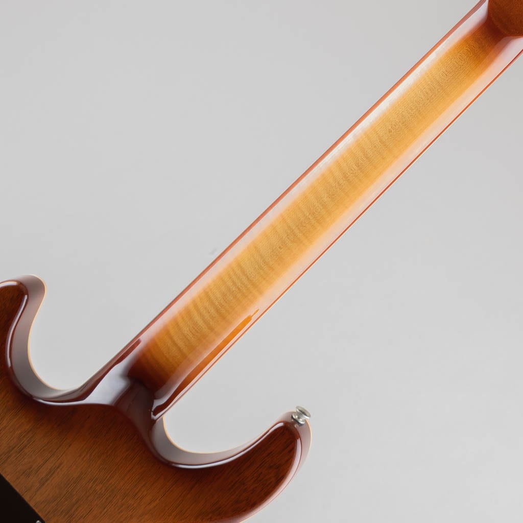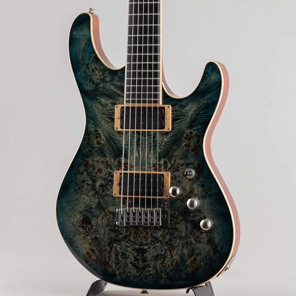 本機はPoplar burl Topのインパクトのあるルックスが特徴の7弦オーダーモデルです。fibenareらしいエキゾチックウッドを用いた美しいデザインに目が行きがちですが、演奏性においても特筆すべき完成度を誇っております。コントロールには特徴的な3way rotaryを搭載しており、洗練されたルックスながらも非常に幅広い音色を網羅。弾き手の創造性を妨げないポテンシャルの高さを持っています。ピックアップにはFibenareオリジナルのALV56を搭載。ほど良いコンプ感と煌びやかな高音域を併せ持ち、7弦モデル特有の唸るような低音域においても分離が良く、バンドアンサンブルにおいても埋もれず前に出てくるサウンドとなっております。