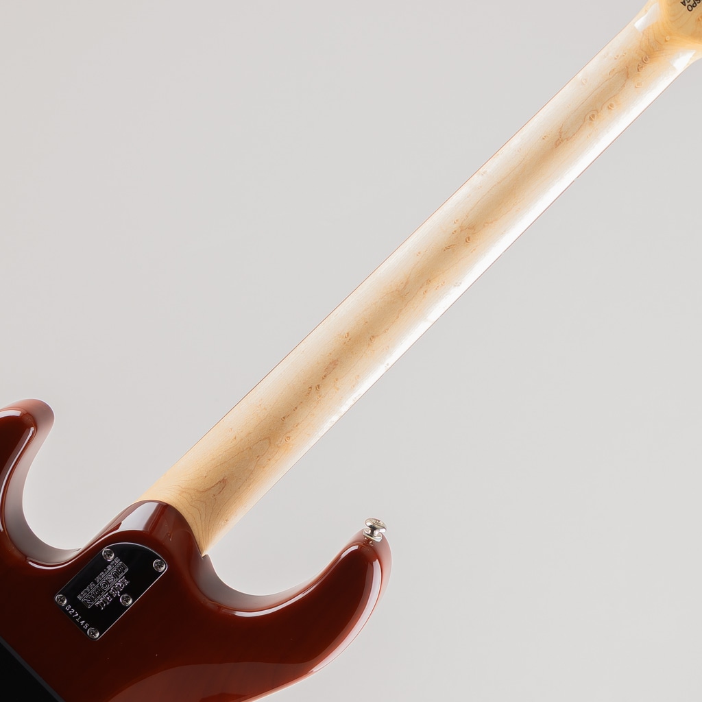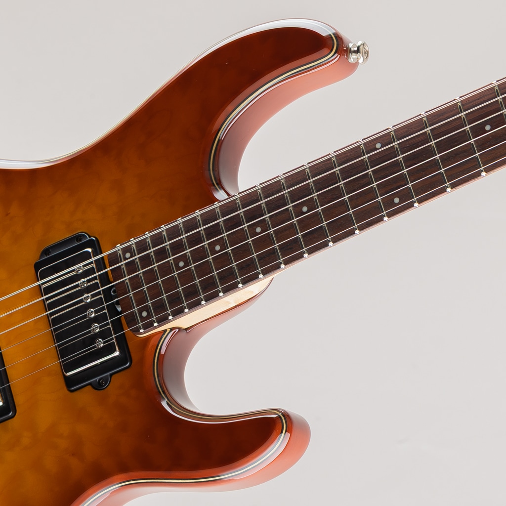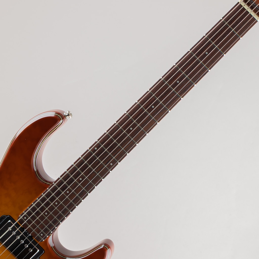 コンター形状に合わせて湾曲させ張り合わされた美しいフレイムメイプルトップに3プライの化粧板を挟んだアルダーバックのボディ、ネックには希少なバーズアイメイプルを使用。カラーはアニバーサリー専用カラーとなるキャラメルバーストのマッチングヘッド。そして同年よりギターに初導入されたコンペンセイテッドナットを採用。ピックアップにはディマジオ製カスタムピックアップ2基と記念モデルに相応しい豪華な仕様。クランチやリードサウンドが心地よく、ハリと温かみのあるファットなトーンを出力します。トップ全体の面取り加工も美しく手間をかけて製作されている様子が窺えます。