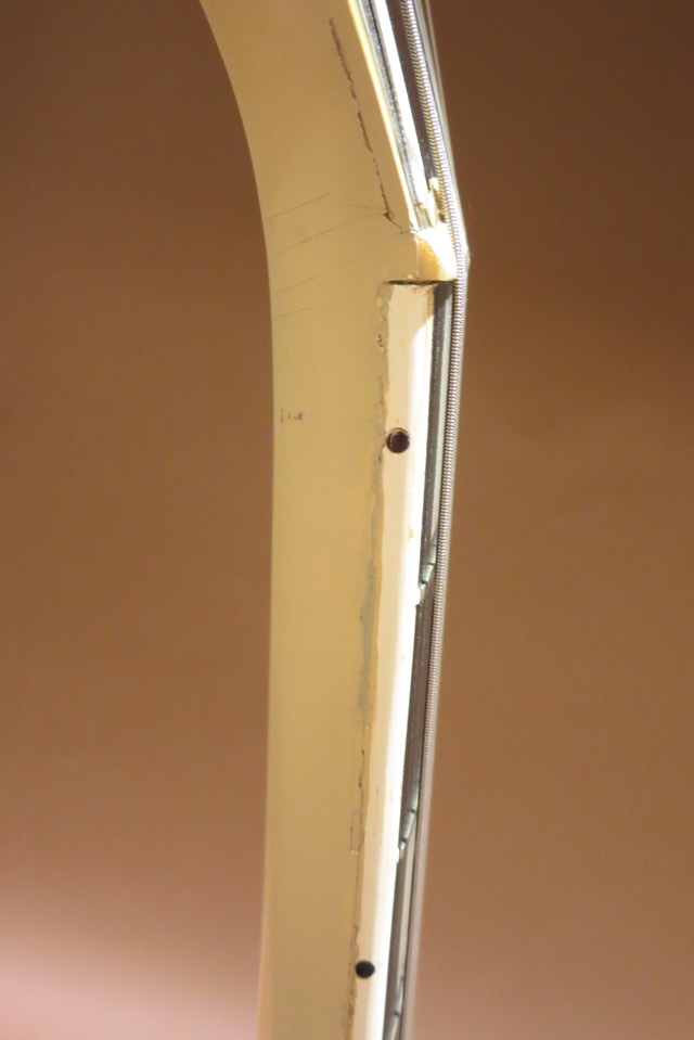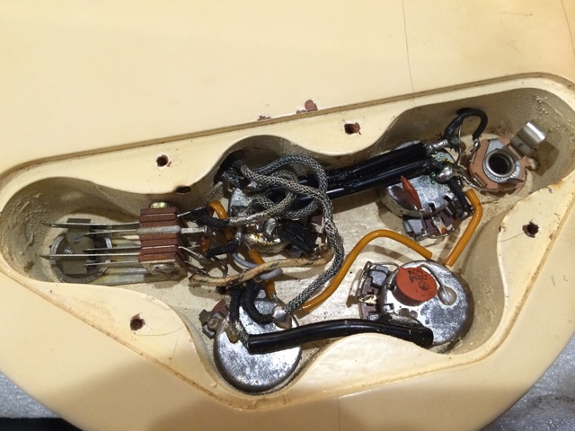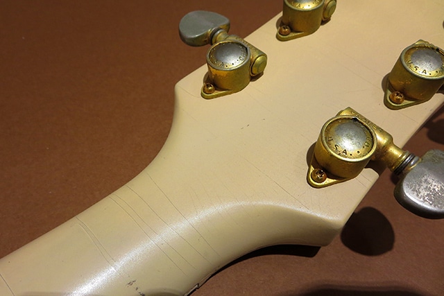 ヘッド裏に木部クラック・リペアが見られますが、しっかりと補修されておりますのでご使用にあたって全く問題はありません。リペア歴はありますが、パーツのオリジナル度は高く、ジャック、いくつかのビスに交換が見られる程度で、その他はオリジナルコンディションをキープ、オリジナルのフレットレスワンダーも健在です。センターセレクト時にリア&センターのノーマルMIX配線にされており、実用的なセンターサウンドをお使い頂けるようになっております。