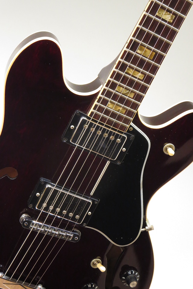 3pcsメイプルネック期のものでボディの空洞が大きめな構造の年代にあたり、ブライトかつ広がりのあるアコースティック感溢れるサウンドは程よいエアー感とカラッとしたクリスピーさが調和したトーンをアウトプットし明瞭かつグッと前に抜けるミッドレンジは弾いていてとても心地良いものがあります。あくまで自然に立ち上がるサウンドは嫌味のない存在感を感じさせてくれます。また本機はこの年代に見られるコイルタップ仕様のものでカッタウェイ部にマウントされたトグルSWで各ピックアップのハム/シングルの切り替えが可能となりサウンドバリエーションも豊富です。クリーンサウンドでのコードプレイやカッティングプレイではよりいっそサウンドが際立ちます!