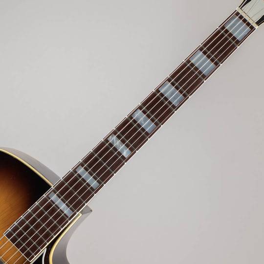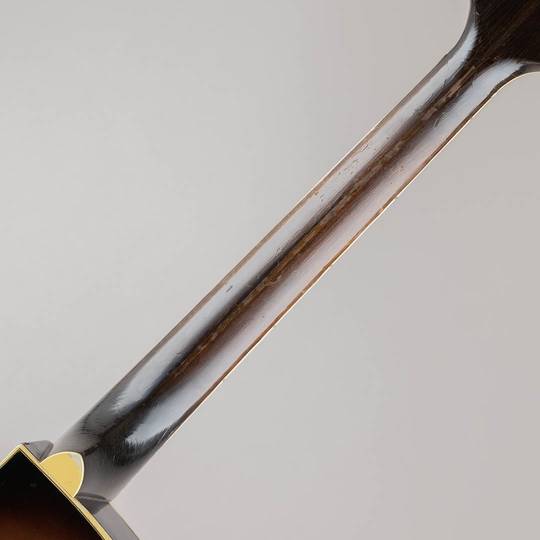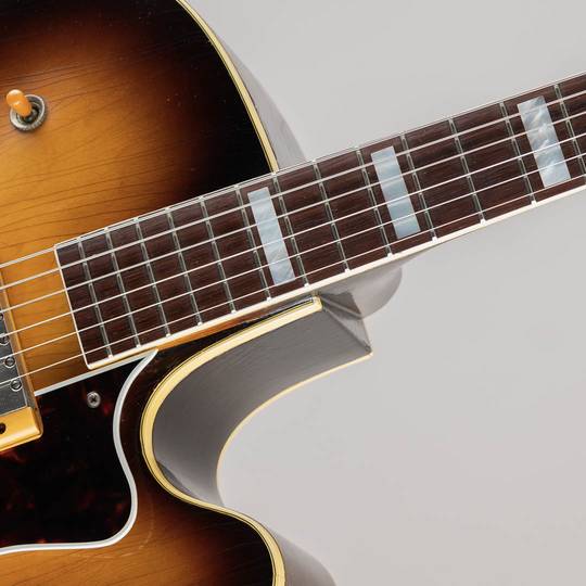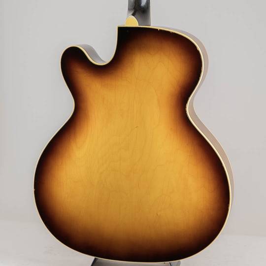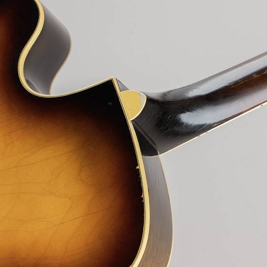 本機は1957年にGibsonに買収されカラマズー工場にて製造された個体となります。ラミネートメイプルボディ/マホガニーネック/ハカランダ指板のウッドスペック。グラマラスな曲線を描いたトップ面は美しく、17インチボディからなる豊かな生鳴りと経年変化による枯れた響きは格別。ネックシェイプはエッジのあるV字ながら、ナット幅が40mmとなっておりますのでストレスを感じにくいプレイアビリティでございます。その他、独特な丸みのあるヘッドロゴ/8角形のキャロセルノブ/パテント入りのフリークエンセーター・テールピース等、歴史を感じる魅力的なパーツが搭載されております。