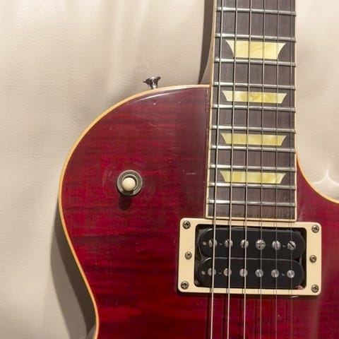 2000年製の本機。使用に伴いエルボー部分の塗装が剥がれ露出しているフレイム、バックル痕、ヘッドのクリアラッカー剥がれ等、なかなかな使用感はございます。とはいえ、生々しい傷跡から醸し出している歴戦の猛者感はなかなかお目にかかれないロック感溢れるテイストでございます。フレットには凹凸が見受けれず7割ほどの残量。トラスロッドの効き幅は左右ともに余裕がございますので、これからも活躍を期待できるネックコンディションでございます。ストラップピン/コントロールノブが交換され、その他はオリジナル。付属品としてはGibson製ハードケース、中古保証6ヶ月が付属致します。