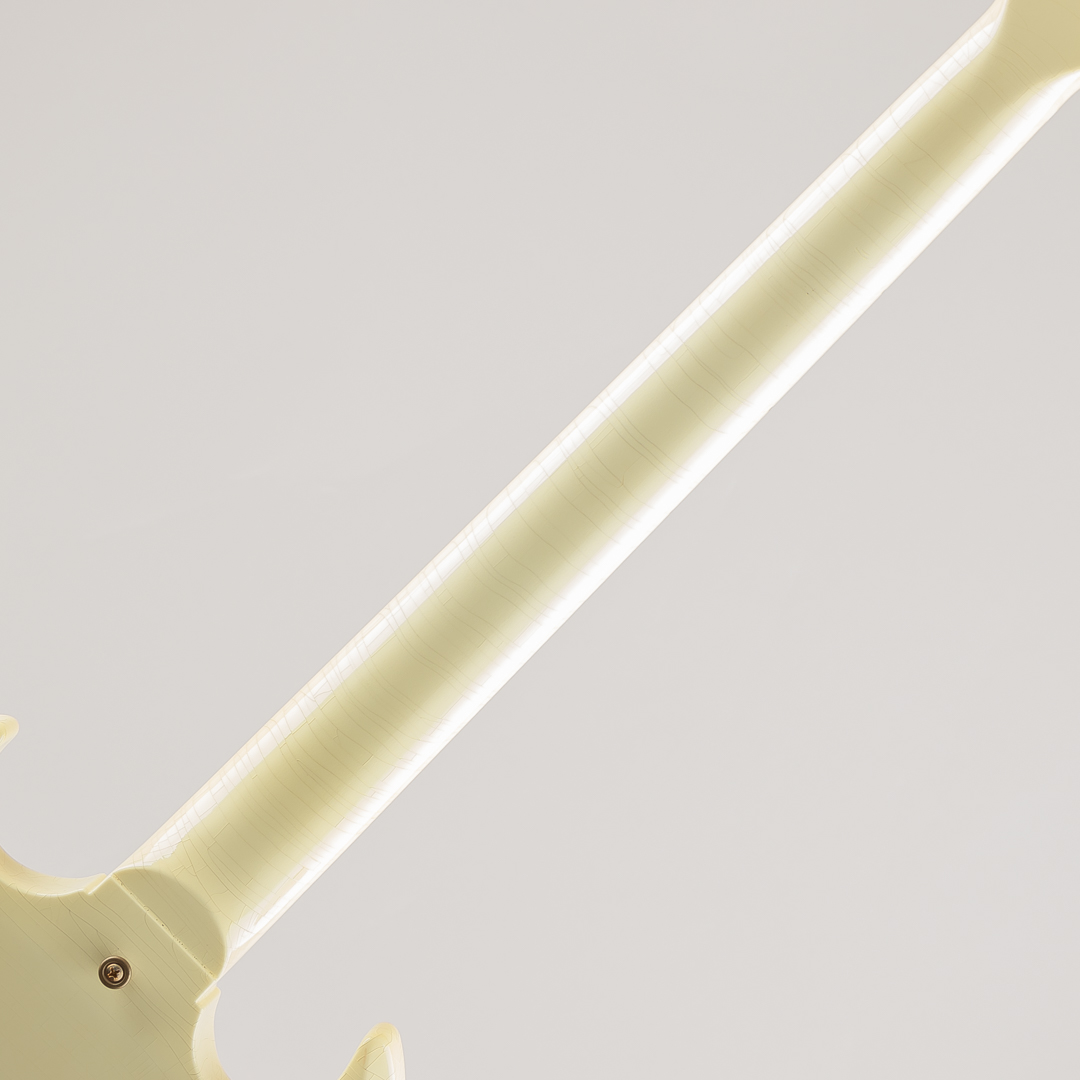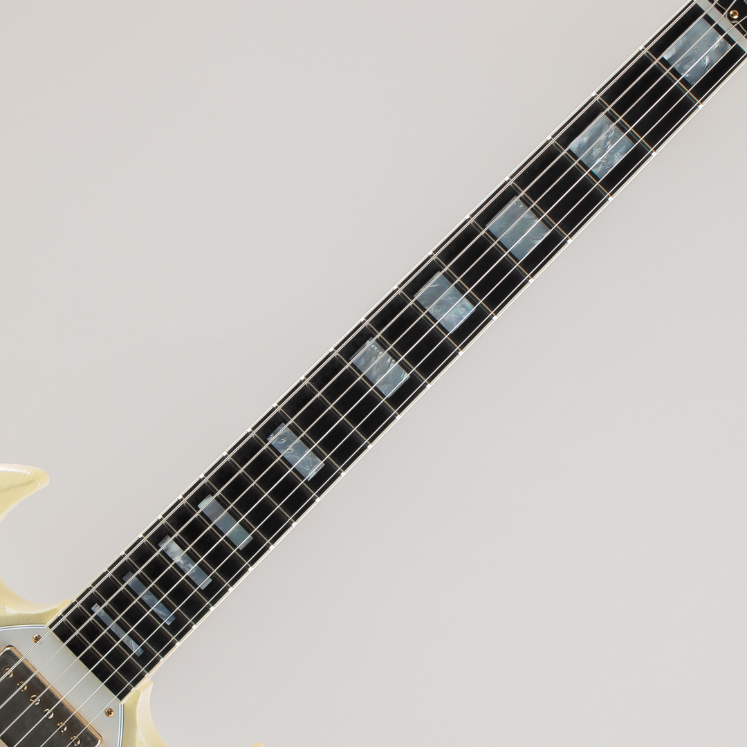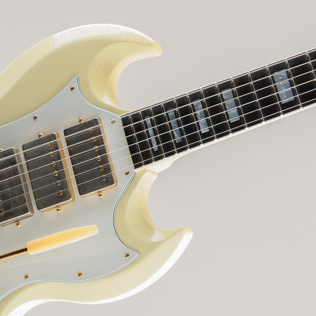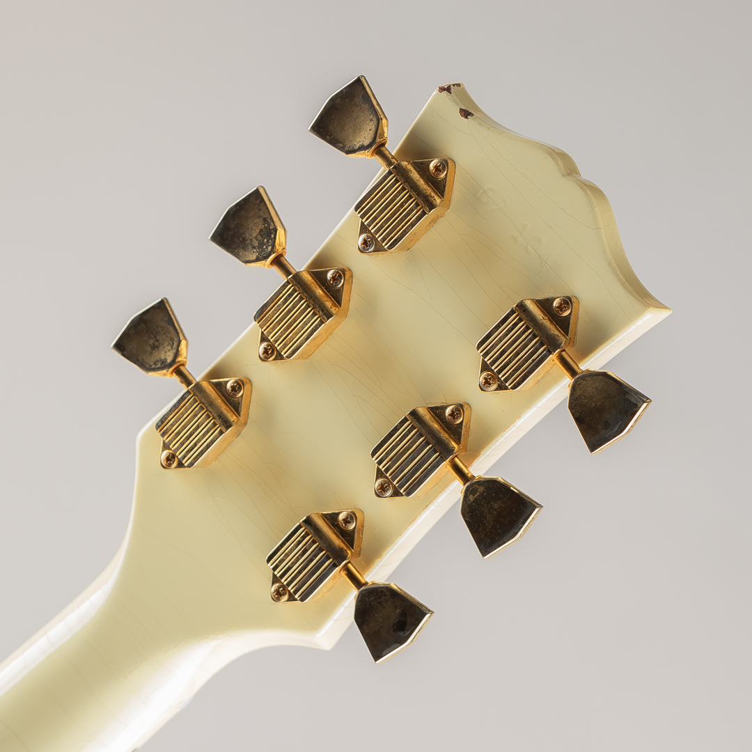 ウッドマテリアルは、マホガニーボディ / マホガニーネック / エボニー指板にて構成。フィニッシュにはやや日焼けしたような色合いが特徴的なポラリス・ホワイトカラーに、Murphy Labのエイジド加工によるウェザーチェッキングや金属パーツへのくすみ等が施されております。その他のパーツ類は、クルーソンワッフルバックペグ / ABR-1ブリッジ / マエストロ・ヴァイヴローラ / ラージピックガードとなり、"Custom"らしいスプリットだイヤモンドインレイ / ブロックインレイ等も勿論採用されております。